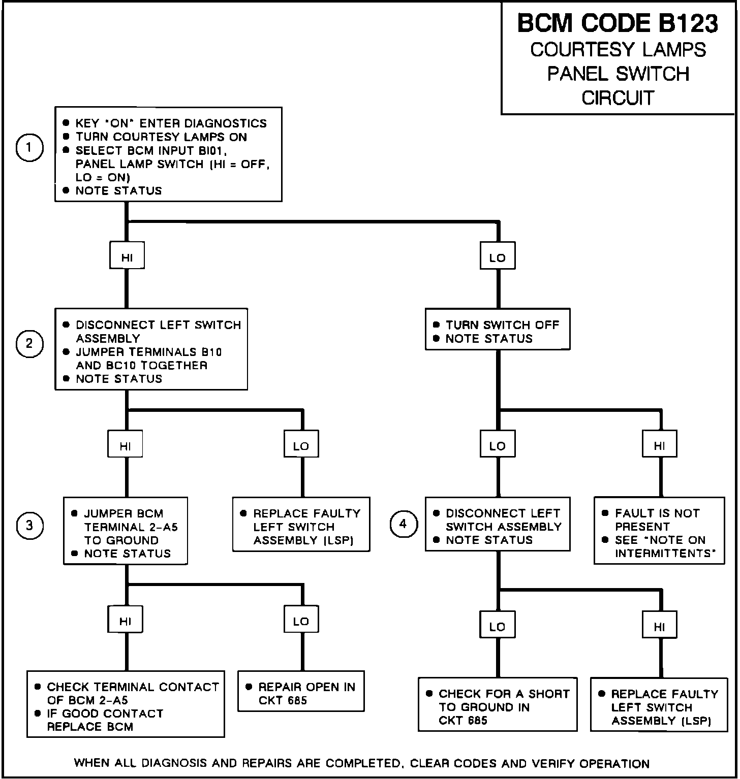 If an intermittent code B123 is being set, manipulate CKT 685. When BCM input B1O1 change-of-state indicator displays an "X", check the circuit at that location for the intermittent fault.