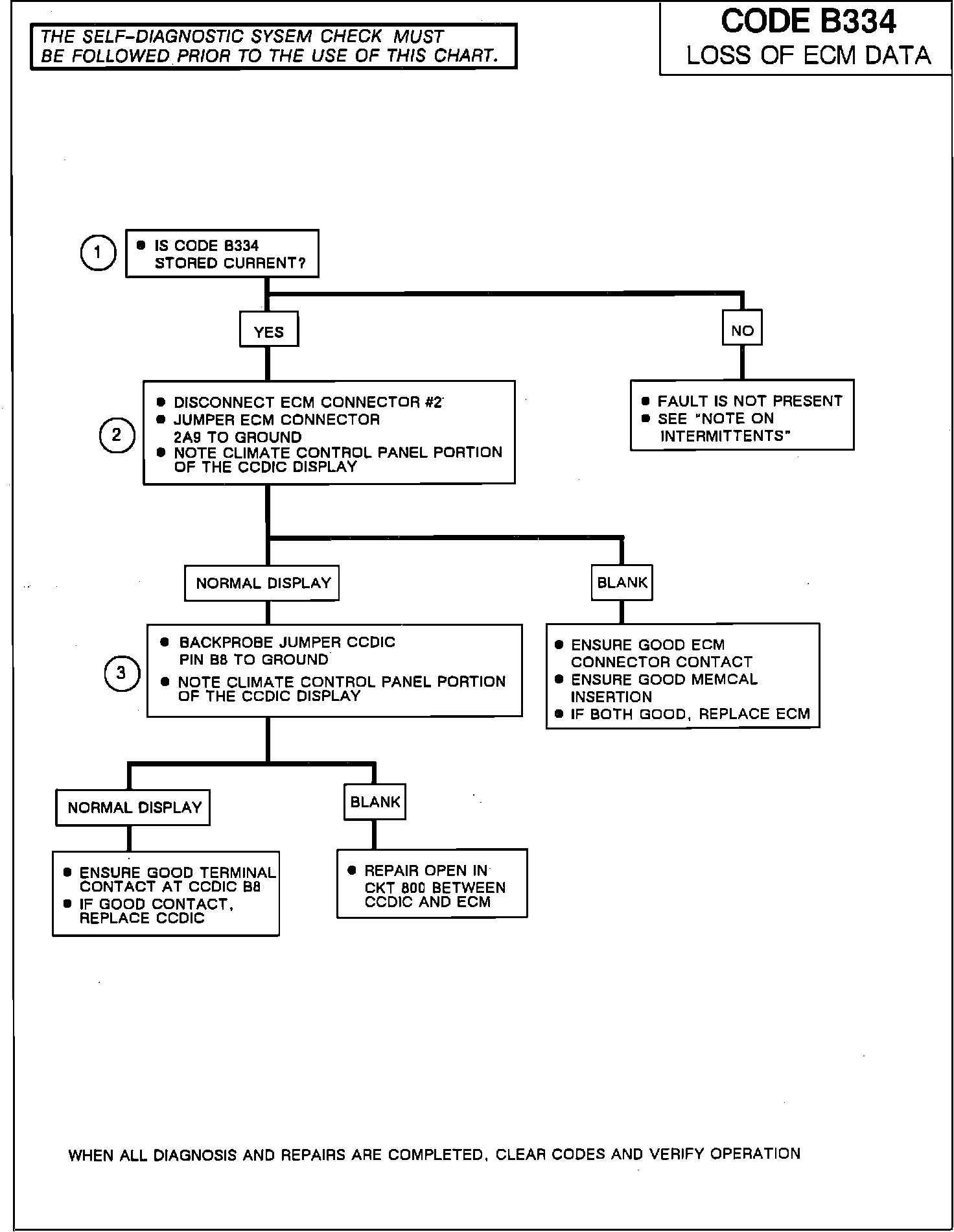 Code B334 will set if the ignition is on and the BCM is not able to exchange data with the PCM/ECM (if any other communication codes are stored along with B334, see Multiple Intermittent Codes chart). When this is the only communication code stored, the problem must be one of the following: