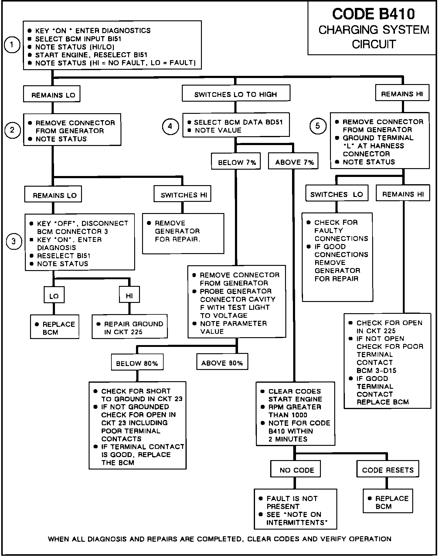 Code B410 will set if there is an open or short to ground in either CKT 23 or CKT 225, a drive belt break or if an undervoltage or overvoltage condition exists. If there is a short to ground on CKT 225, the "NO CHARGE" telltale will light on the IPC.