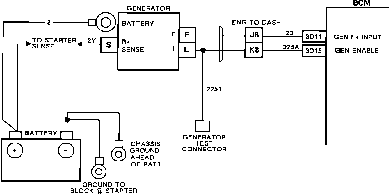 The generator on this vehicle has fault detection capability built into the regulator. The BCM will supply 12 volts to the regulator over CKT 225, the I-terminal, and monitor the field voltage of the generator by way of a PWM signal over CKT 23, the F+ terminal.