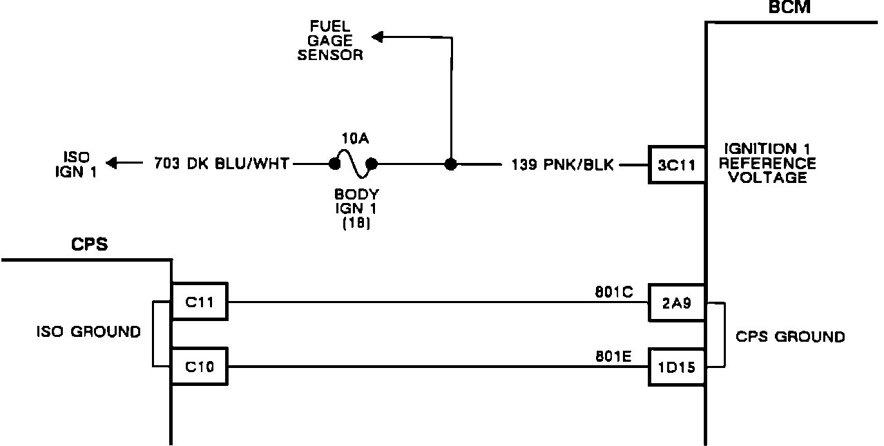 The BCM monitors ignition 1 voltage on terminal "3C11" as a reference for fuel control. Codes B411 and B412 are set when the ignition is "ON" and the engine speed is above 800 rpm as follows.