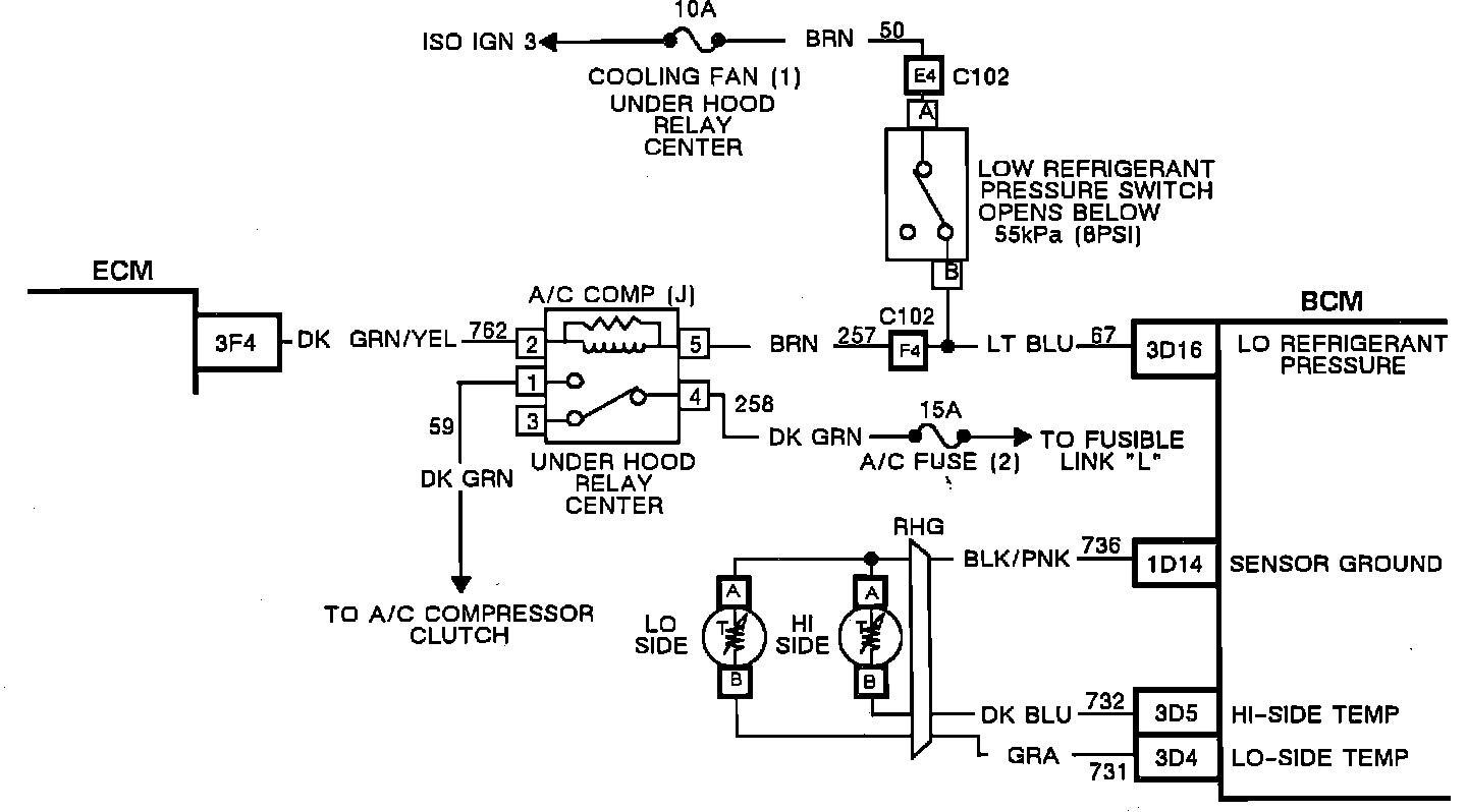 In the process of controlling the compressor clutch, the BCM monitors certain system inputs for an indication of low refrigerant charge. The BCM monitors the normally closed low refrigerant pressure switch at pin 3D16. The status of the low pressure switch is checked prior to compressor engagement. IF the return voltage to the BCM indicates the switch is open, the compressor will not be allowed to engage and a code B448 will be set in diagnostics. Additionally, the CCDIC will switch to ECON mode and the A/C low refrigerant message will be displayed.