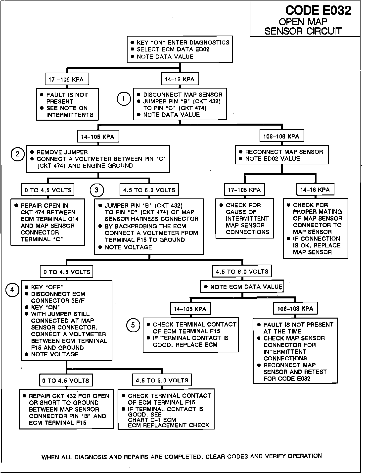 The Manifold Absolute Pressure (MAP) sensor, is a sensor that changes resistance based upon manifold vacuum. The PCM/ECM provides a 5 volt reference and ground. The MAP signal varies between ground and 5 volts as manifold vacuum varies. Code E032 is designed to set when the PCM/ECM detects a MAP sensor signal that is too low.