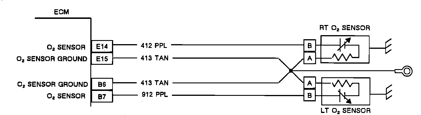 3. The PCM/ECM compares oxygen sensor signal voltage received on circuit 412 to the ground voltage on circuit 413. If the PCM/ECM doesn't have a good ground to the engine on circuit 413, the oxygen sensor can appear falsely high or low. With engine running, use a voltmeter to measure voltage from the oxygen sensor at the exhaust manifold to the PCM/ECM terminal A1. If the voltage is -.05 volts to +.05 volts then the ground is OK. If the voltage is less than -.05 volts or greater than +.05 volts, repair poor ground on CKT 413 between PCM/ECM terminal A1 and the ground at front of engine, right (rearmost) head.