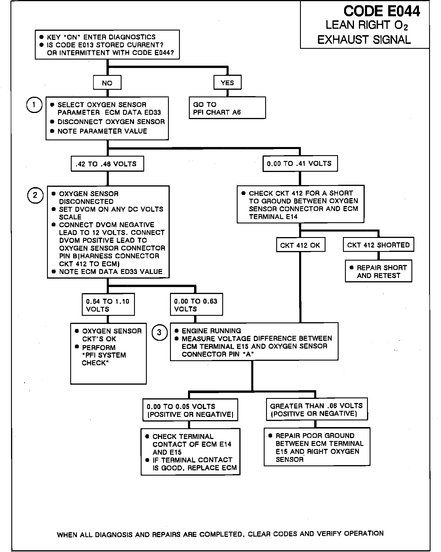 Engine running, manipulate the oxygen sensor and PCM/ECM wiring and connectors while observing PCM/ECM data ED33. If the fault is induced, ED33 will jump below .37 volts and the "ECON" status light will go off. Manipulate CKT 413 ground to the engine and look for a loose ground eyelet or ground eyelet installed at wrong location. If lean engine operation is suspected, perform the PFI SYSTEM CHECK under "C" CHARTS. "Excessive Exhaust Emissions" - NOx. An engine that is misfiring may have a lean oxygen sensor indication because of unburned oxygen in the exhaust stream. If the oxygen sensor circuit appears to be OK, go to OXYGEN SENSOR CIRCUIT CHECK under "C" CHARTS, to check for faulty or contaminated sensor.