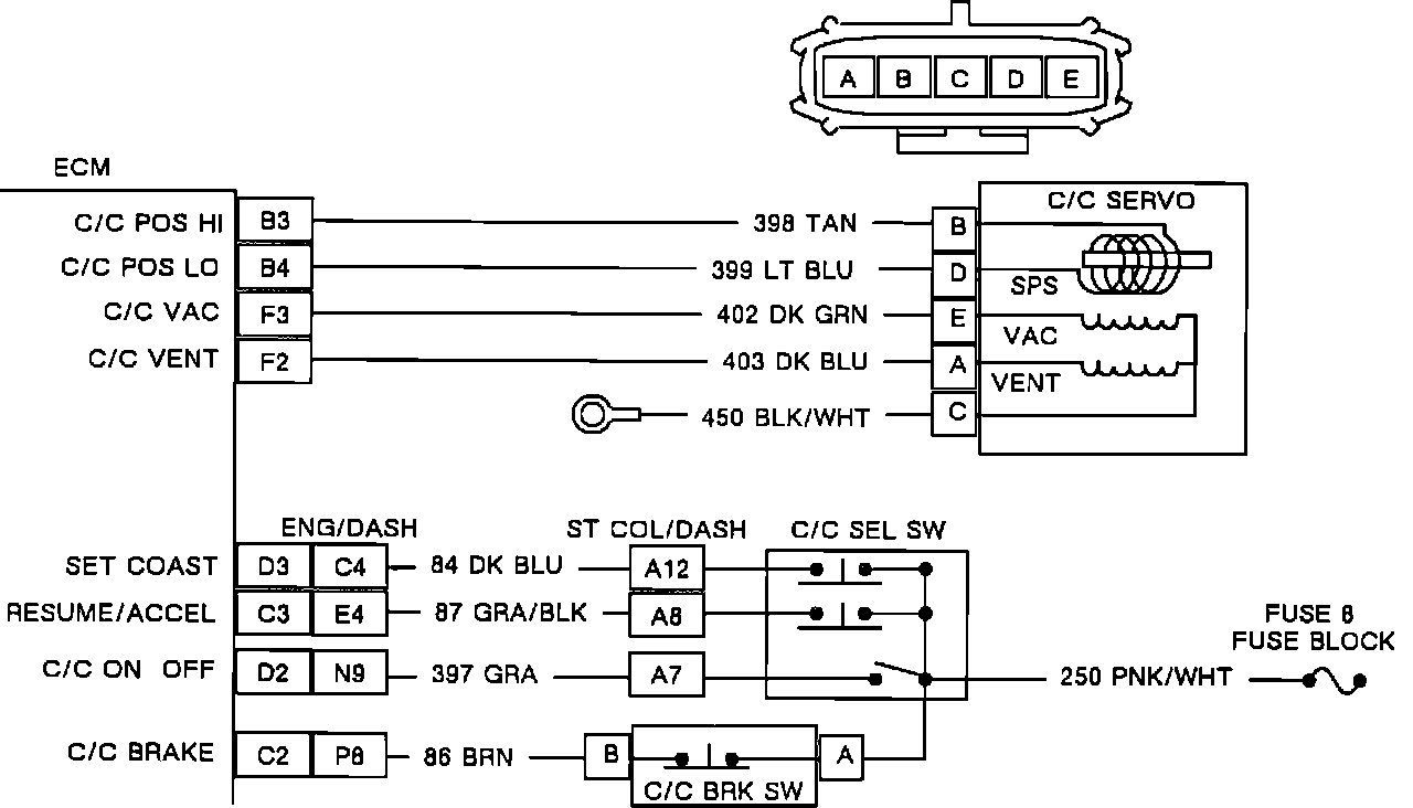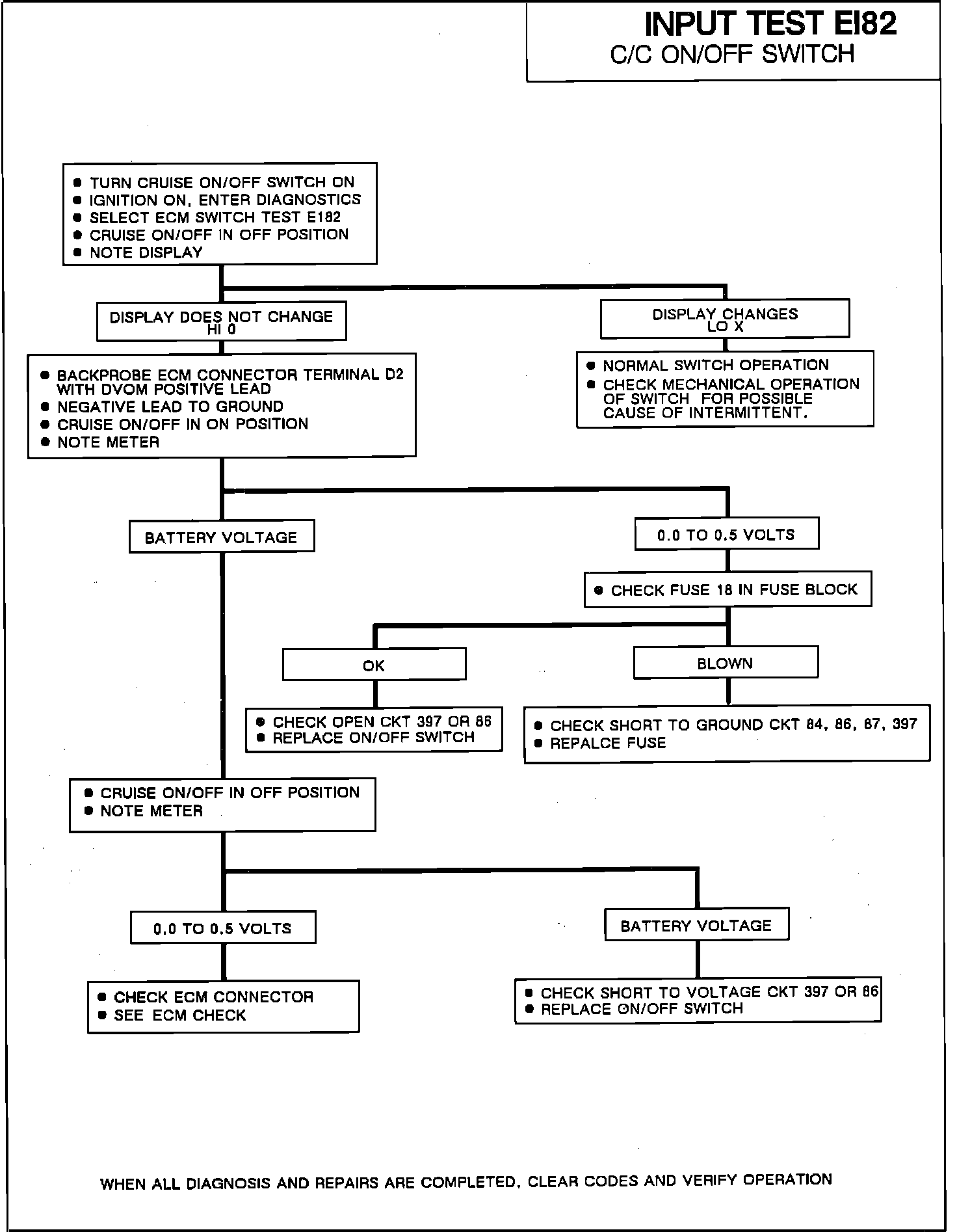 After the diagnostic trouble codes have been displayed, the Driver Information Center (DIC) will display "ECM?". Depress the HI blower button. The display will change to read PCM/ECM data. Depress the LO blower button. The display will change to read PCM/ECM inputs. Depress the HI blower button. The display will change to read C/C BRAKE EI70. Place the cruise control ON/OFF switch in the ON position. Depress the LO blower button four times. The display will change to read LO 0 C/C ON/OFF EI82. When the cruise control ON/OFF switch is placed in the ON position the display will change to read HI X. The change from 0 to X indicates that the test has been successfully completed.