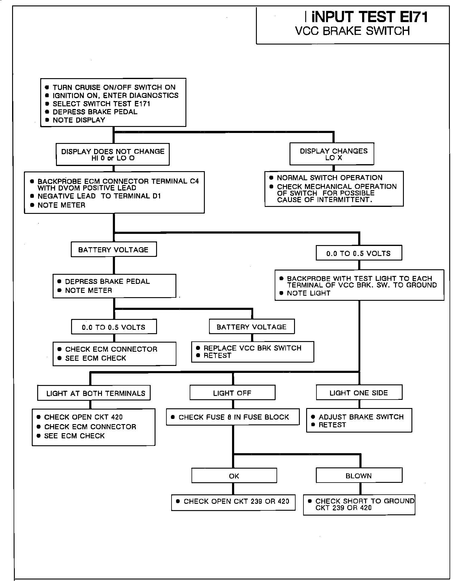 After the diagnostic trouble codes have been displayed the Driver Information Center (DIC) will display "ECM?". Depress the HI blower button. The display will change to read PCM/ECM data. Depress the LO blower button. The display will change to read PCM/ECM inputs. Depress the HI blower button. The display will change to read C/C BRAKE EI70. Depress the LO blower button. The display will change to read HI 0 VCC BRAKE EI71. When the brake pedal is depressed and released the display will change to read LO X. The change from 0 to X indicates that the test has been successfully completed.