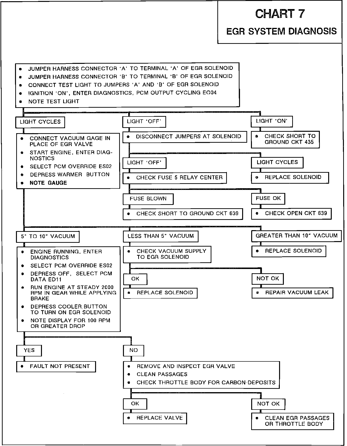 ^ Connect a vacuum gauge to the EGR valve vacuum supply. There should be no vacuum with the engine idling. If there is, follow chart C-7 above. With the gauge hooked to the EGR valve vacuum supply, disconnect the EGR solenoid connector. There should be more than 8 inches of vacuum available. If not, repair leak or obstruction in EGR valve vacuum hose.