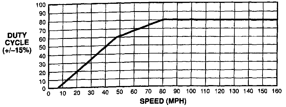 The Control Module regulates the amount of steering assist at a given vehicle speed by driving the steering assist solenoid valve with the correct PWM duty cycle. The amount of steering assist decreases with increasing duty cycle. See Figure 24 for a typical duty cycle vs. speed curve. The Control Module constantly monitors the steering assist solenoid valve PWM drive for correct activity. At times, the Control Module expects the output to be high (on) and at times it expects the output to be low (off). At other times, the Control Module expects the output to cycle between high and low levels. If the expected level or cycling is not detected, the Control Module stores error code 35, activates the "SERVICE CCR"/ "SERVICE SSS" telltale lamp and de-activates the steering assist drive. Recovery of the steering assist output fault will occur if normal activity is detected after a 30 second delay.