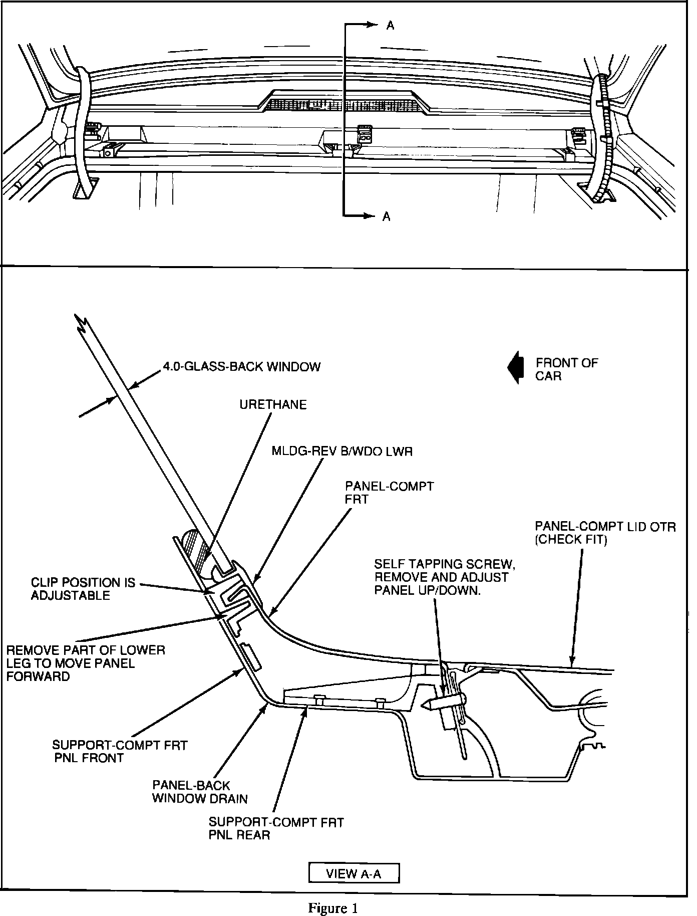 Remove the tulip panel and relocate the supports (near glass) to any one of three available mounting slots. Selecting the correct slot will allow movement of the panel approximately 1 mm in either direction. If greater fore/aft movement is necessary, remove the panel and shave up to 2 mm from the lower leg. Remove only enough to allow proper panel alignment. Refer to Figure 1.