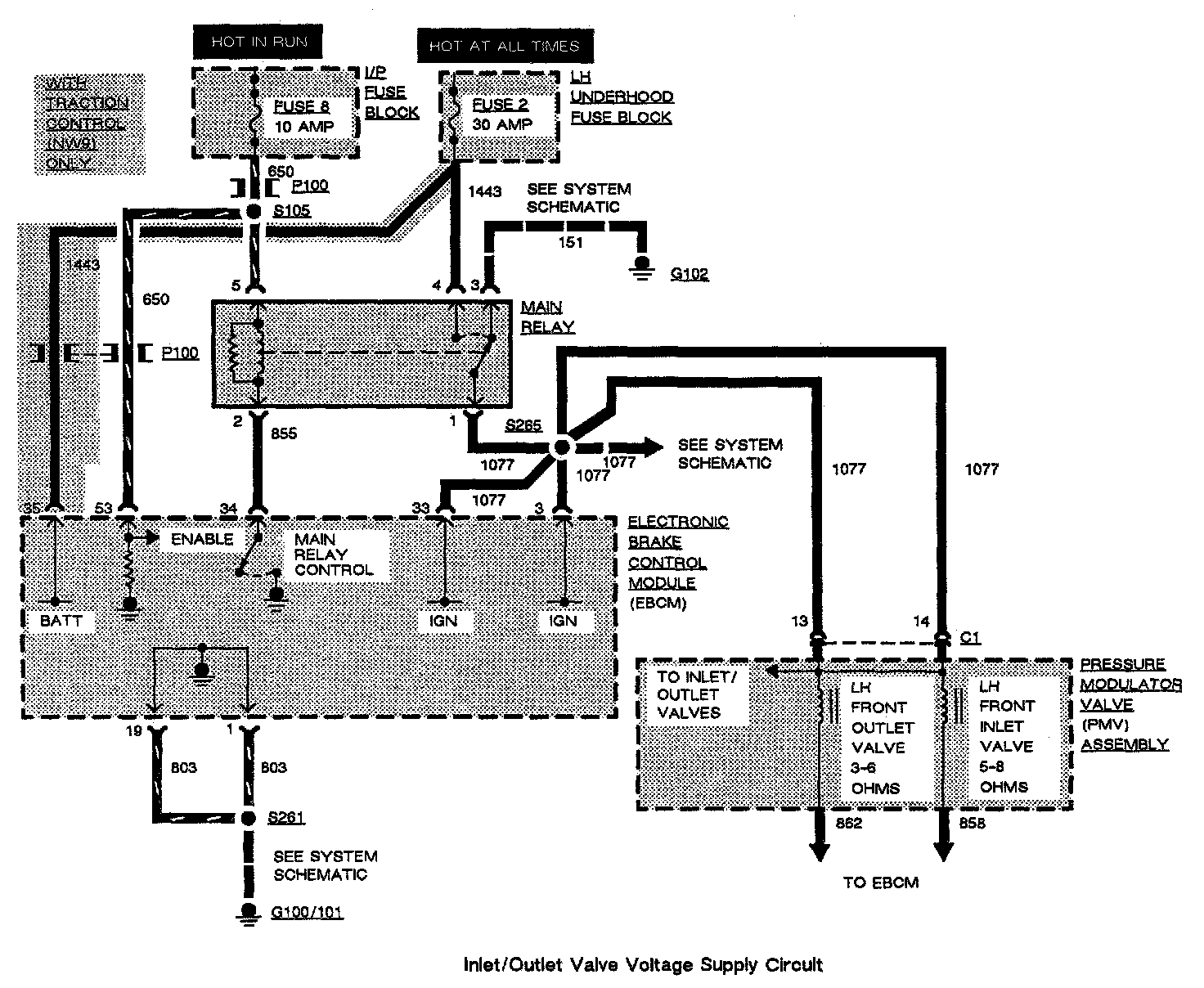 When the ignition is first turned to "RUN, the electronic brake control module (EBCM) goes through a self-check lasting 2-4 seconds. During this test the EBCM grounds terminal 34, energizing the main relay. Once the self-check is completed the main relay remains energized. This delivers battery voltage to both the EBCM and the pressure modulator valve (PMV) assembly during vehicle operation. The constant voltage supply allows the vehicle to enter ABS mode without delay. The main relay is de-energized whenever the amber "ANTILOCK" indicator lights due to a system fault, causing the ABS system to shut down.