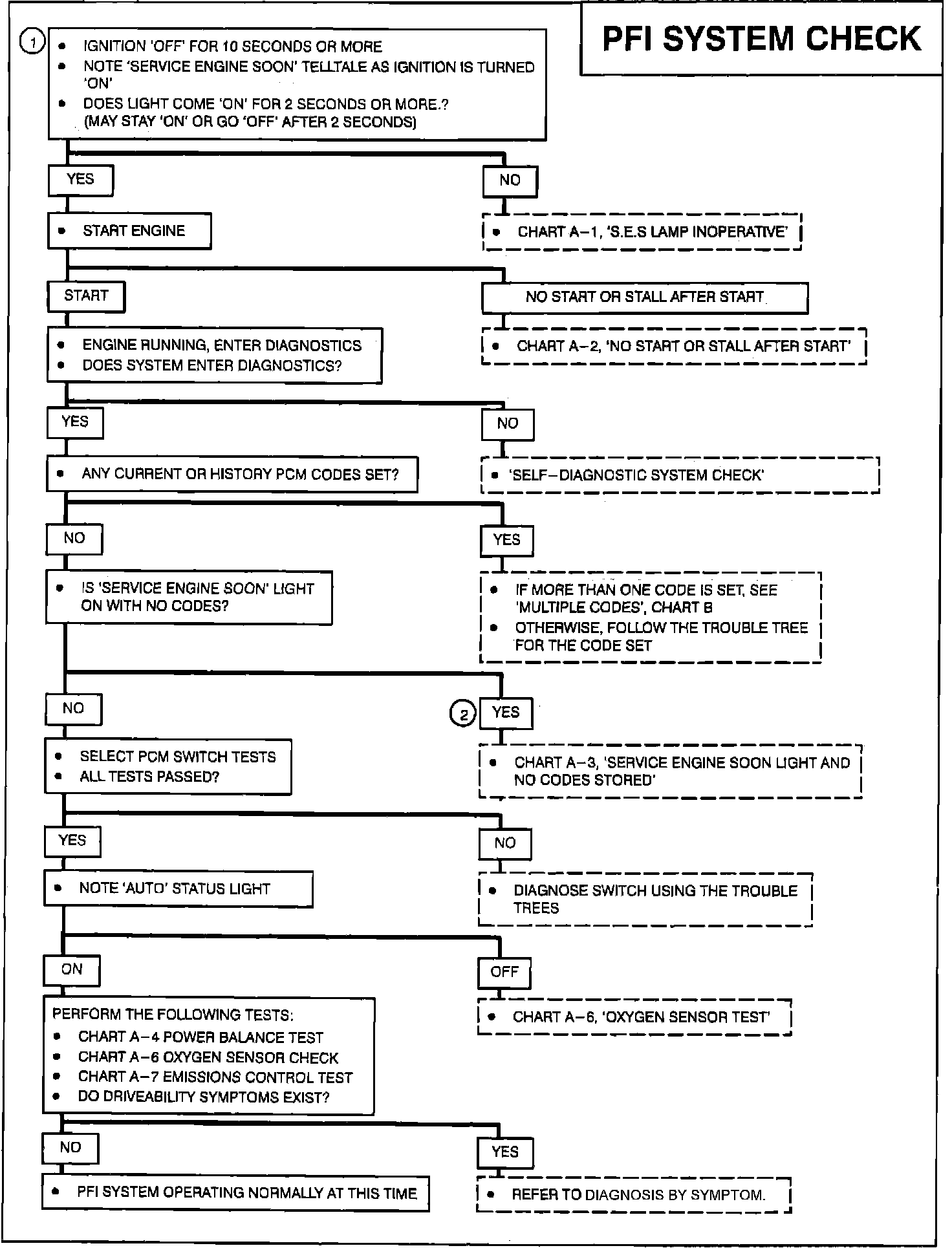 The PFI system check should be the starting point for all diagnosis. As a Master chart, it will direct you to performance tests or charts that can be found under DIAGNOSTIC CHARTS. If any codes are stored go to the appropriate trouble code chart first then proceed with the PFI System Check.