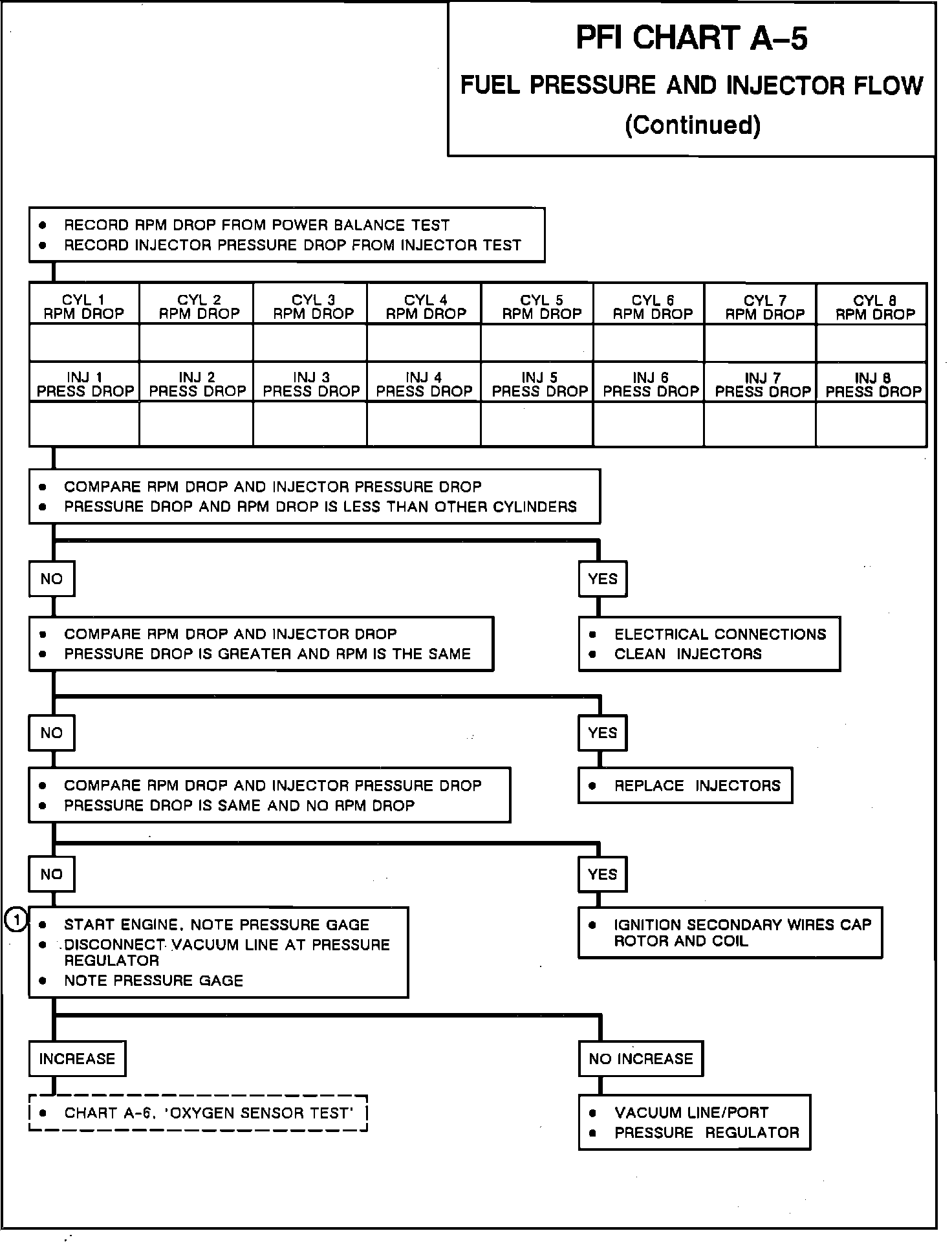 This chart analyzes the comparisons between the power balance test and the injector flow test to determine the condition of the fuel injectors. If the fuel injectors are in good condition, the ignition secondary may be the cause of the problem.