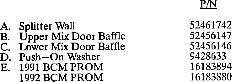 If 1992 model and VIN sequence are after breakpoint N4257163 or if 1991-1992 models have had bulletin T-92-30 performed previously (on-board diagnostic parameter -31 would be 59 for 1991 and 67 for 1992), then there is no need to replace splitter wall or air mix door baffles. In this case only, just replace BCM PROM as indicated in step 26 of this bulletin. For warranty purposes use Labor Operation N4801 for .6 hour when replacing PROM only.