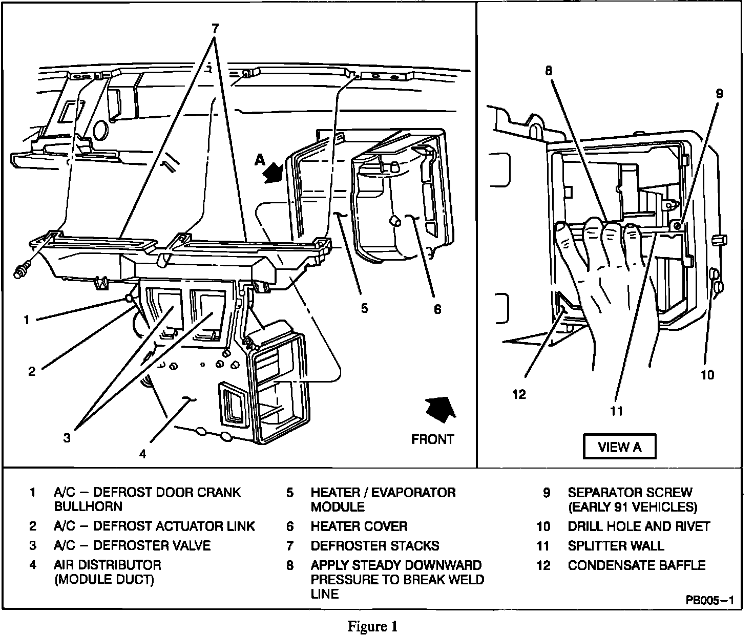 If after inspection of the above items no problem is found, then the problem may be caused by the improper mixing of the air by the baffles contained in the HVAC module. To correct this condition replace parts as shown.