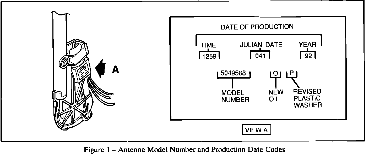 To repair the condition replace the antenna with a new part number as shown. The replacement antenna has a lower viscosity oil in the upper motor bearing and revised plastic shim washer. Antennas built after February 10, 1992 (Julian date 041 92) will use the lower viscosity oil and have an "O" suffix after the part number. Refer to Figure 1 for location of part numbers and production dates.