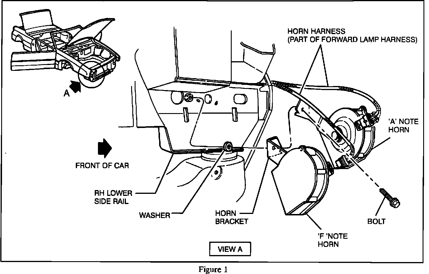 This condition can be corrected by fastening both the "A" and "F" note horn brackets into the existing "F" note horn bracket mounting hole with a new longer mounting bolt, P/N 11515184. To repair this condition use the following procedure: