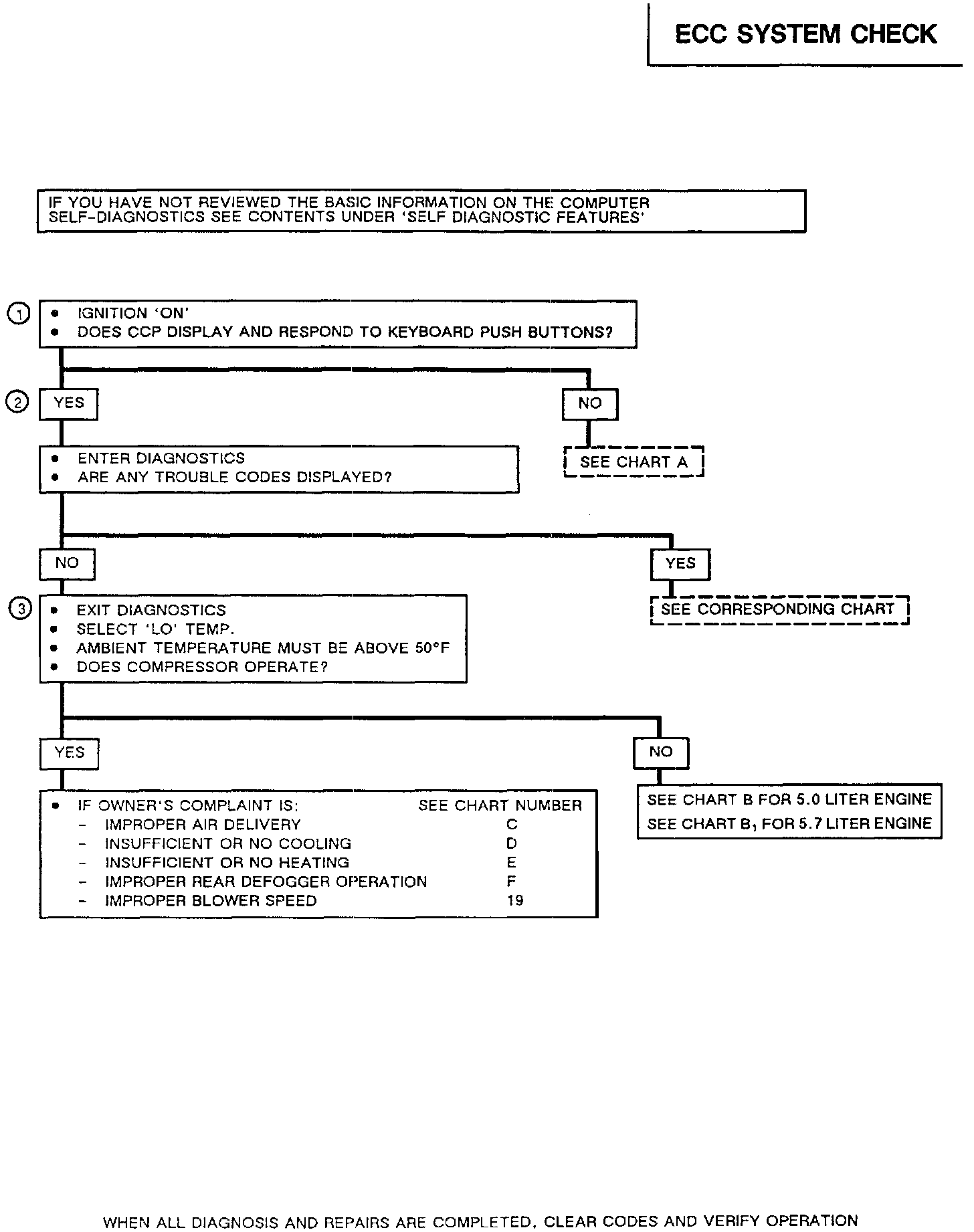THE ELECTRONIC CLIMATE CONTROL (ECC) SYSTEM CHECK IS AN ORGANIZED APPROACH FOR IDENTIFYING A PROBLEM CAUSED BY THE ON-CAR COMPUTER-CONTROLLED ELECTRONICS. UNDERSTANDING THIS CHART AND USING IT CORRECTLY WILL REDUCE DIAGNOSIS TIME AND PREVENT UNNECESSARY REPLACEMENT OF PARTS. IF YOU HAVE NOT REVIEWED THE BASIC INFORMATION ON HOW TO USE THE COMPUTER SELF-DIAGNOSTICS, DO SO.