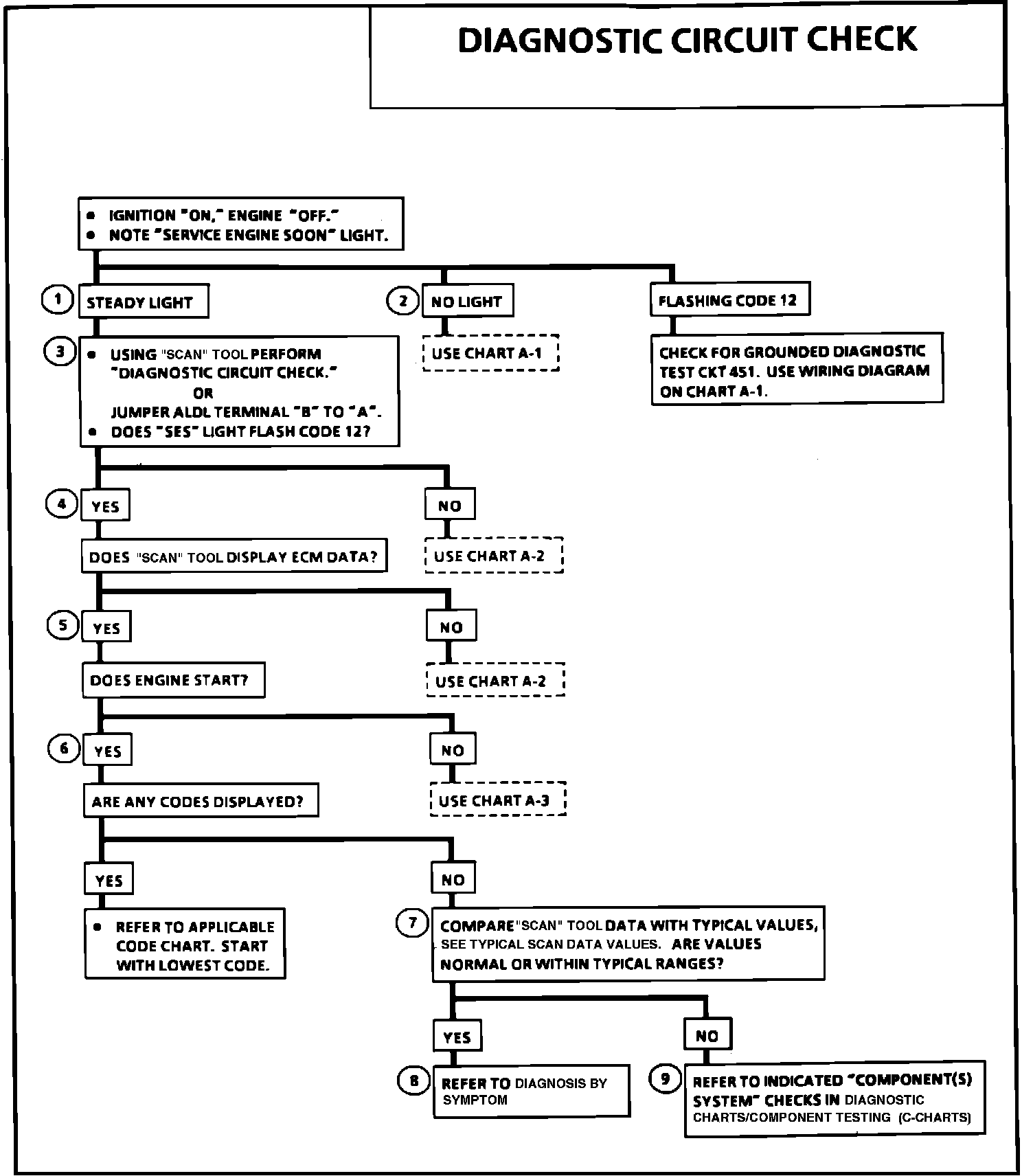 The diagnostic circuit check is an organized approach to identifying a problem created by an electronic engine control or Computerized Engine Control (CEC) system malfunction. This is the starting point for any driveability complaint diagnosis because it directs the service technician to the next logical diagnostic step. Understanding the chart and using it correctly will reduce diagnostic time and prevent the unnecessary replacement of good parts.
