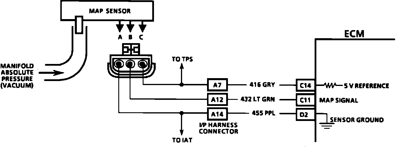 The Manifold Absolute Pressure (MAP) sensor responds to changes in manifold pressure (vacuum). The ECM sends a five volt reference to the MAP sensor. As manifold pressure changes, the output voltage of the sensor also changes. By monitoring the sensor output voltage, the ECM knows the manifold pressure. A lower pressure output voltage will be approximately 1.0-2.0 volts at idle. Higher pressure output voltage will be approximately 4.0-4.8 volts at Wide Open Throttle (WOT). The MAP sensor is also used, under certain conditions, to measure barometric pressure. This allows the ECM to make engine adjustments for different altitudes. The ECM uses the MAP sensor information to control fuel delivery and ignition timing.