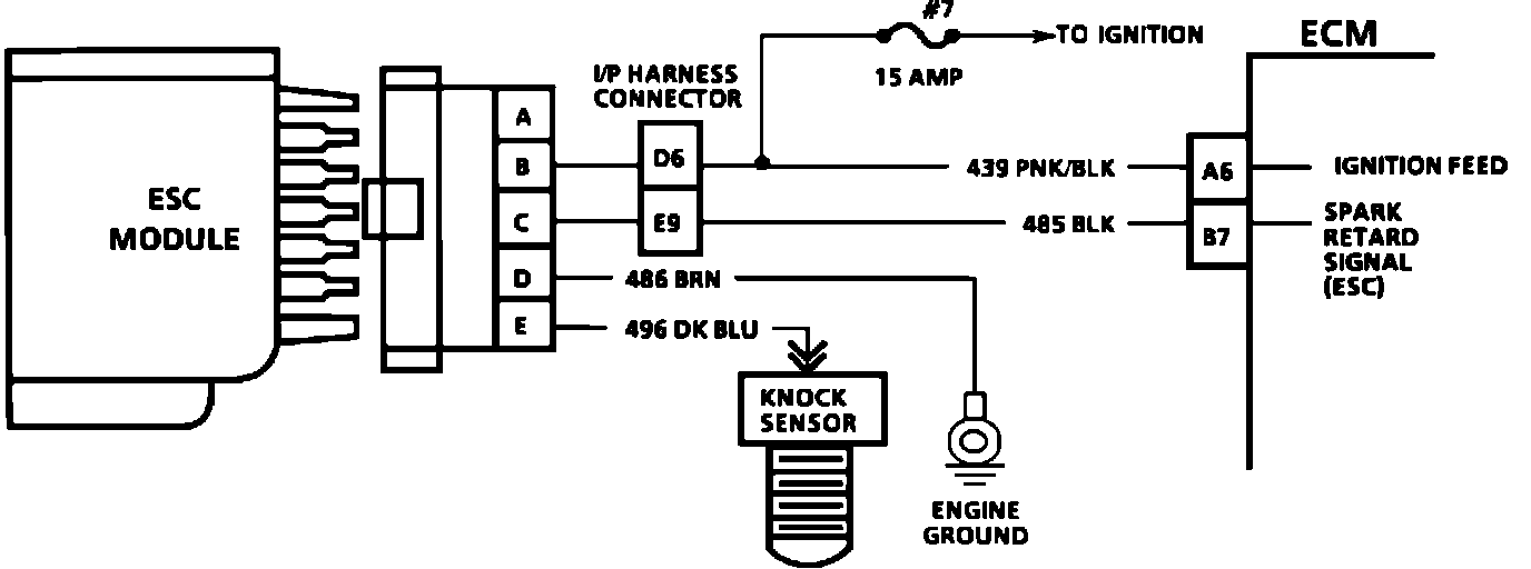 Electronic Spark Control (ESC) is accomplished with a module that sends a voltage signal to the ECM. As the sensor detects engine knock, the voltage from the ESC module to the ECM is reduced. This signals the ECM to retard the timing, if engine speed is over approximately 900 rpm.