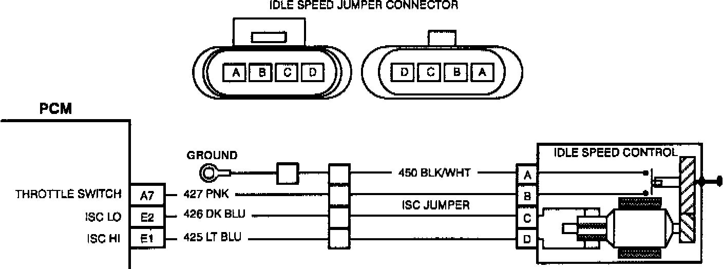 An integral part of the ISC is the throttle switch. The position of the throttle switch determines whether or not the ISC controls idle speed. When the throttle lever rests against the ISC plunger, the switch contacts are closed and the PCM moves the ISC plunger to the programmed idle speed setting. When the throttle lever breaks contact with the ISC plunger, the switch contacts open and the PCM stops sending idle speed control commands. Engine speed is again controlled by the accelerator pedal.
