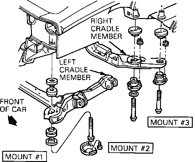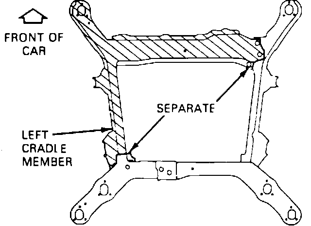 14. Remove left cradle mounts, separate left cradle and remove from vehicle, Figs. 7 and 8.
