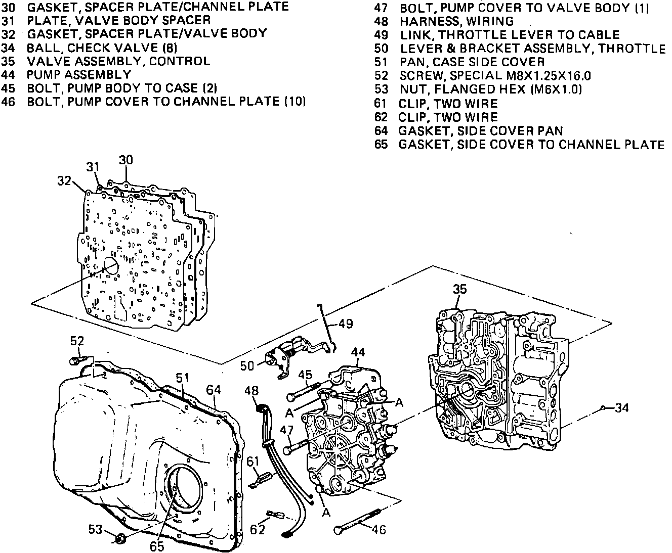 25. Remove valve body retaining bolts and the valve body, noting position of four control valve to spacer plate check balls.