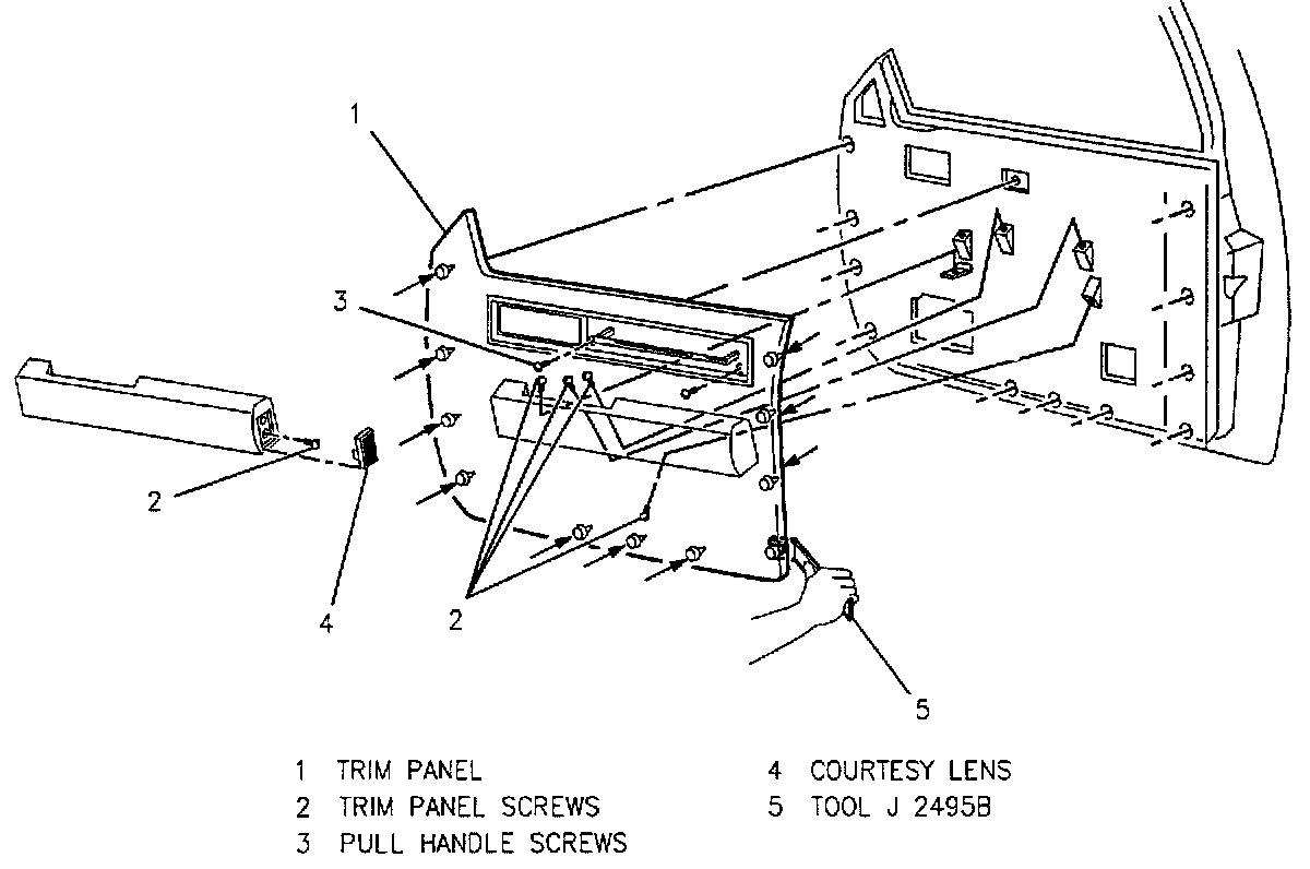 5. Trim panel using tool J 2459B or equivalent, to disengage fasteners on trim panel from holes in door. Disconnect courtesy and warning lamp connectors.