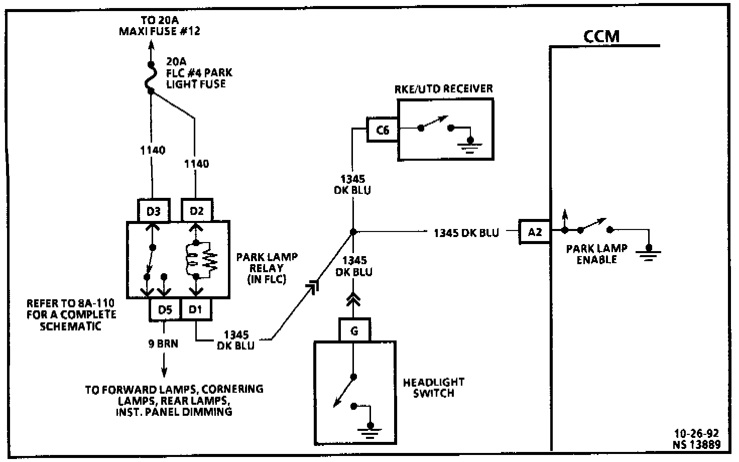The park lamp relay coil circuit can be completed by the CCM, remote keyless entry receiver/UTD, or the headlight switch. Anyone of these three components will enable the parking lamp relay coil to pull the contacts in, thus allowing current to flow from B+ to CKT 9.