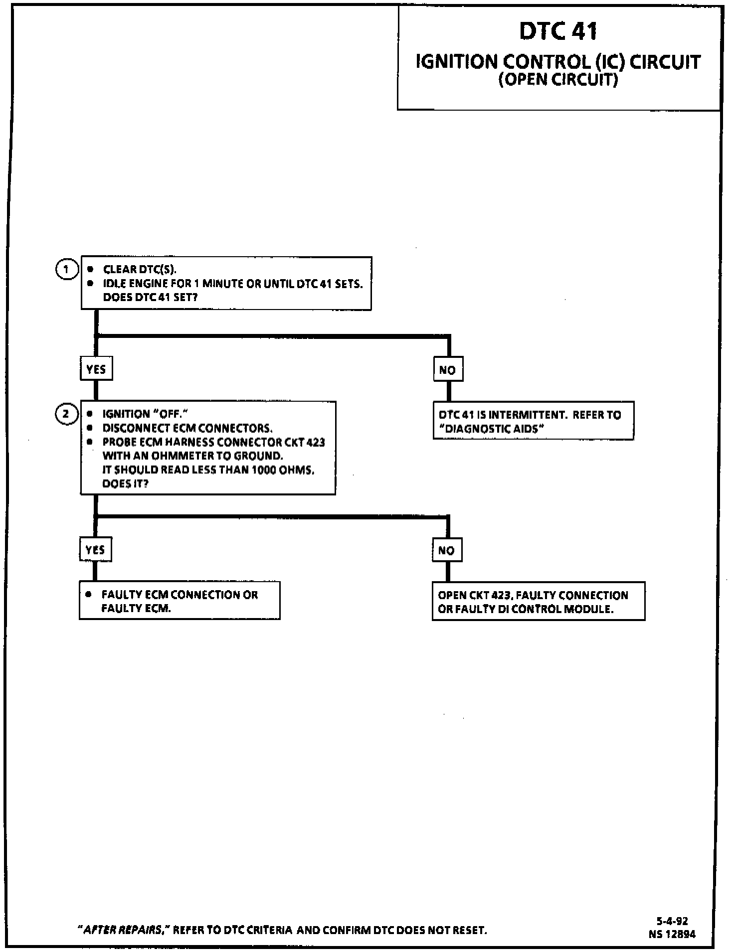 If a DTC 41 was stored and the customer complaints of a "Hard Start," the problem is most likely an open IC line (CKT 423).