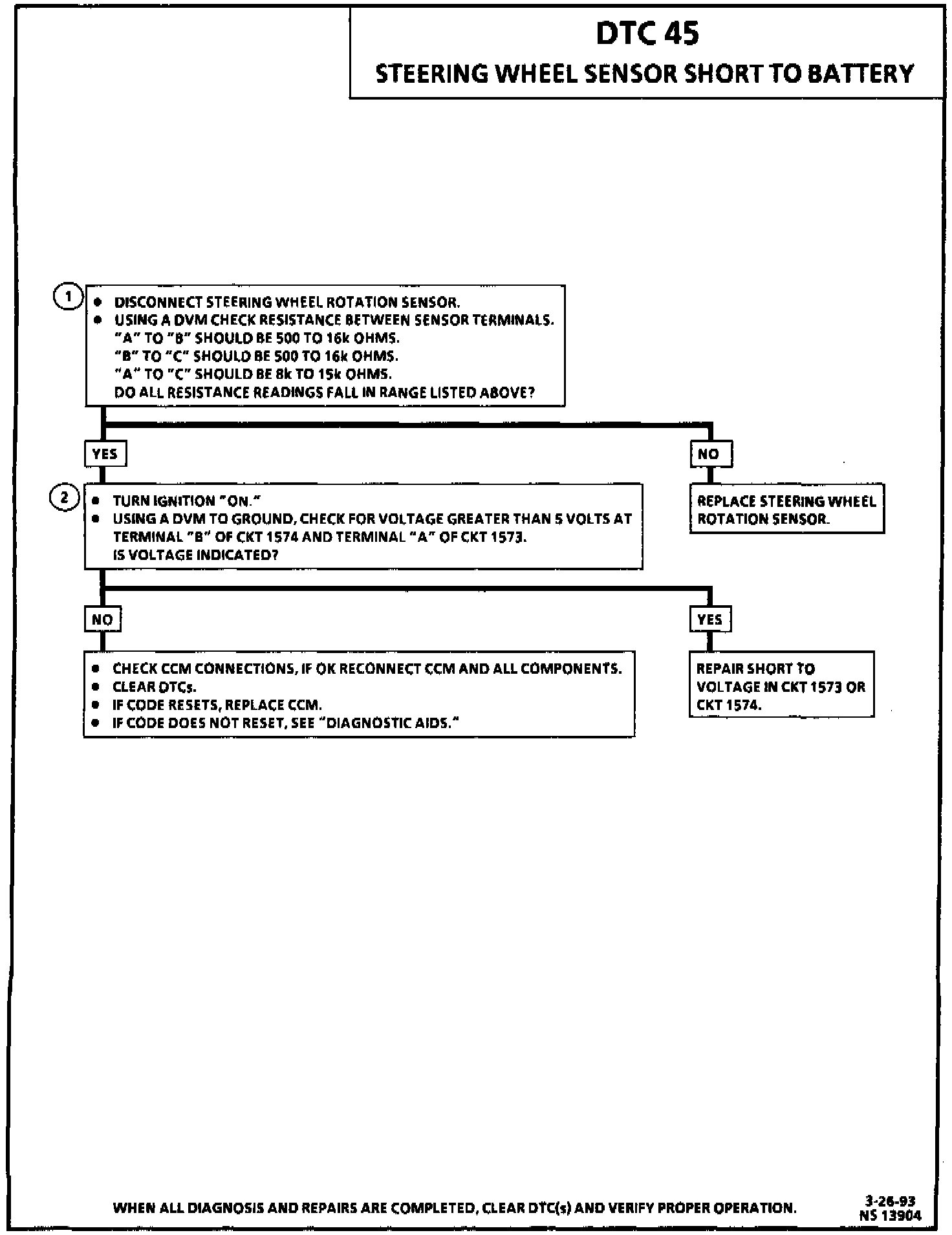 A Tech 1 can be used to monitor the steering wheel rotation sensor input voltage as the wheel is turned or road tested. An open in CKT 1575 can cause a DTC 45 to set, because the steering wheel rotation sense will always be high.