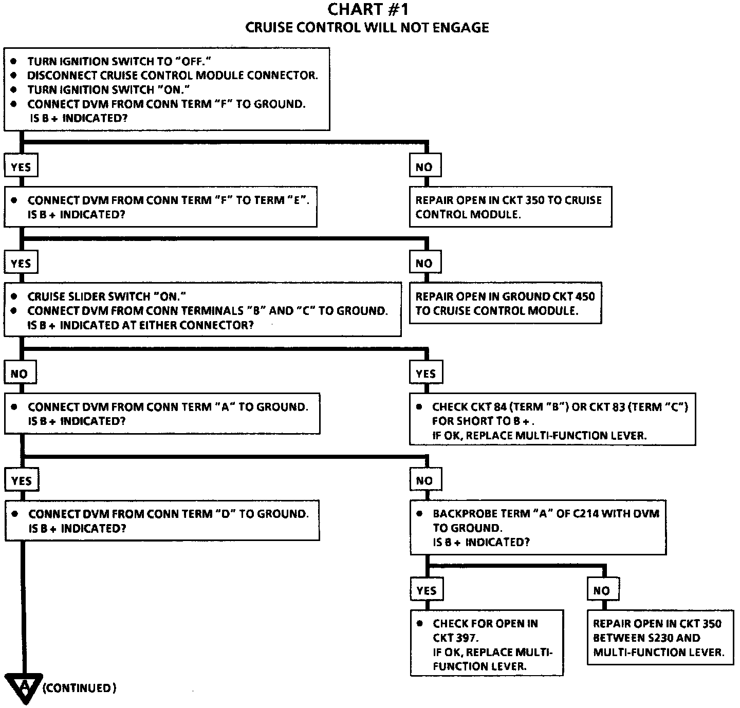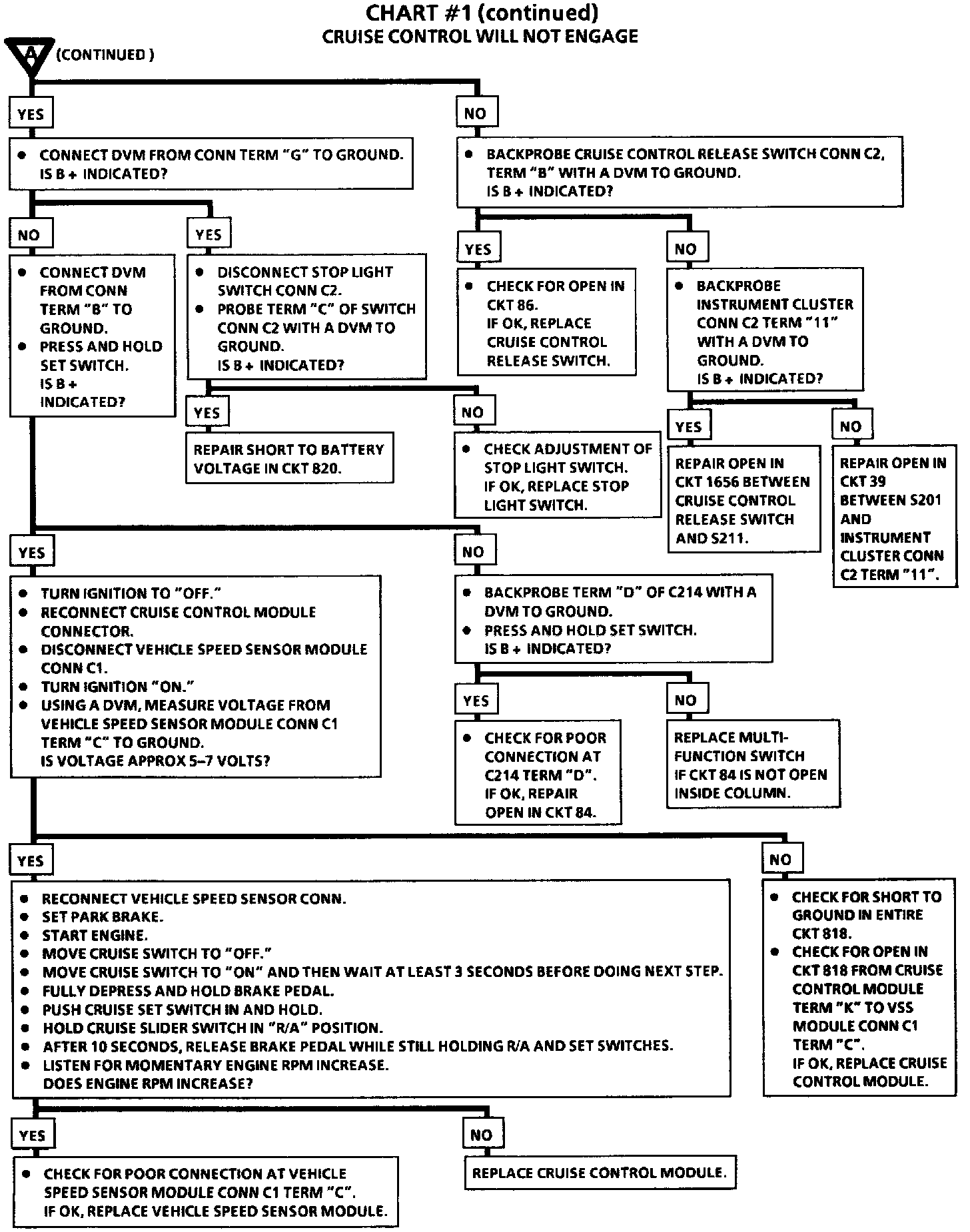 Chart #1 (continued) Cruise Control Will Not Engage: