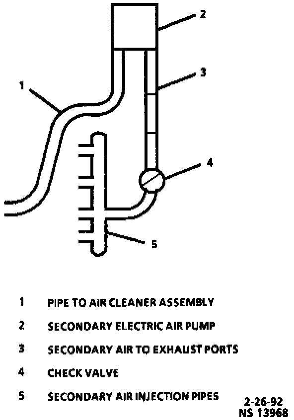 This system consists of an air pump, secondary air injection bypass valve with solenoid, check valve, and necessary plumbing.