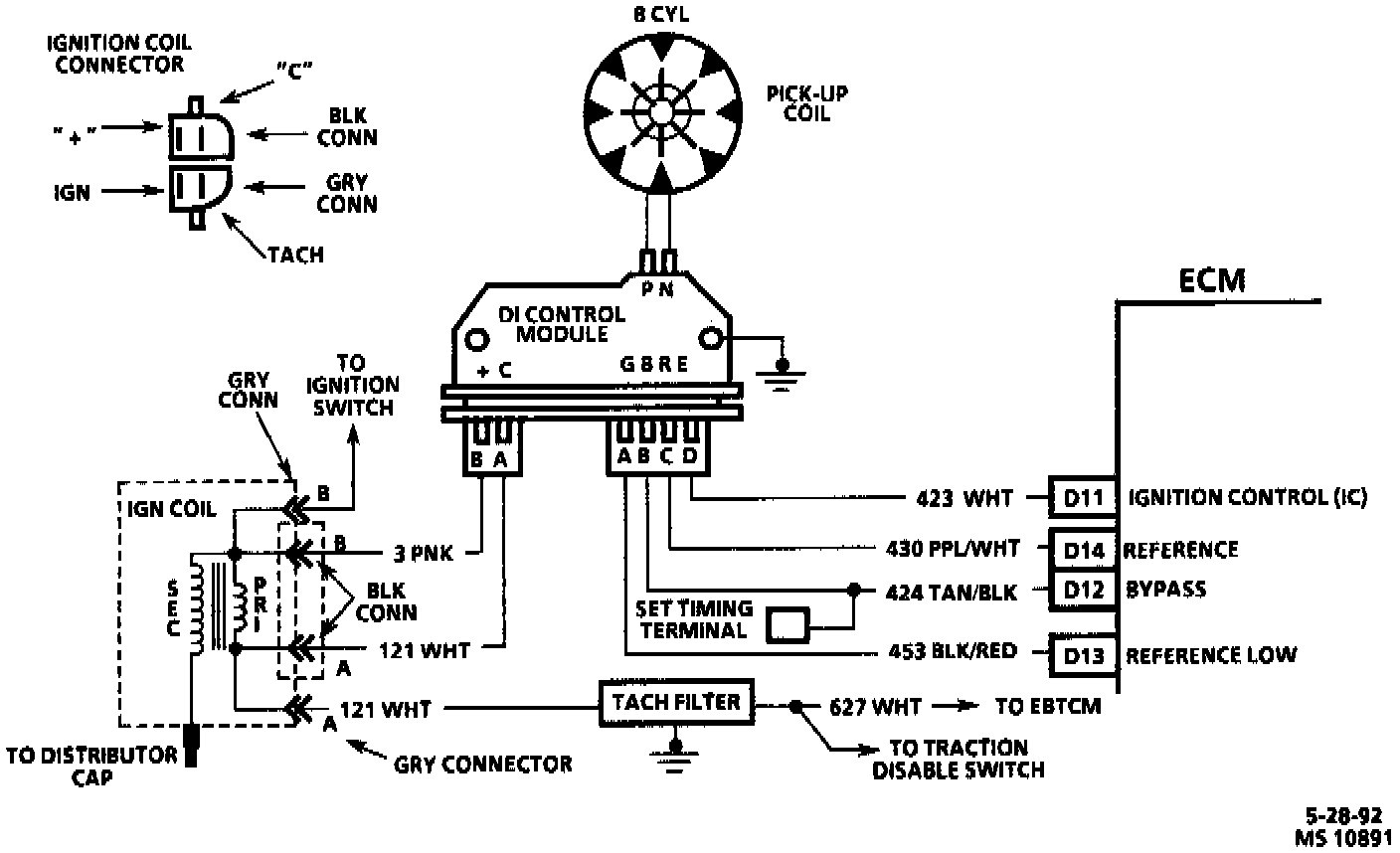 The IC terminal, Circuit 423, triggers the DI module. The ECM does not know what the actual timing is, but it does know when it gets the reference signal. It then advances or retards the spark form that point. Therefore, if the base timing is set incorrectly, the entire spark curve will be incorrect. An open or ground, in the IC circuit, will set a Code and cause the engine to run on the DI module timing. This will cause poor performance and poor fuel economy. An open in the circuit will set a DTC 41, and a ground in the IC circuit will set a DTC 42, and the engine will run on the DI module timing and cause poor performance and milage.