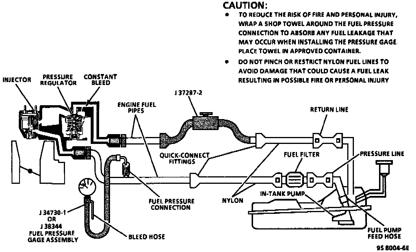 ^ Before connecting fitting, always apply a few drops of clean engine oil to the male pipe end of engine fuel pipe, pressure gauge adapter or fuel line shut-off adapter. This will ensure proper reconnection and prevent a possible fuel leak. (During normal operation, the 0-rings located in the female connector will swell and may prevent proper reconnection if not lubricated.)