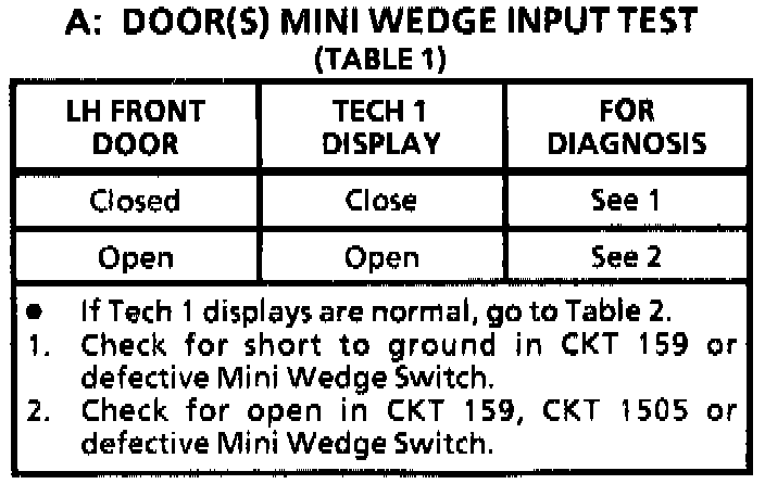 If upon using the Tech 1, the Door Mini Wedge Input Display stays at the same state, with no change displayed when shutting or opening the door(s), this condition will have to be repaired first before testing the Door Mini Wedge inputs.