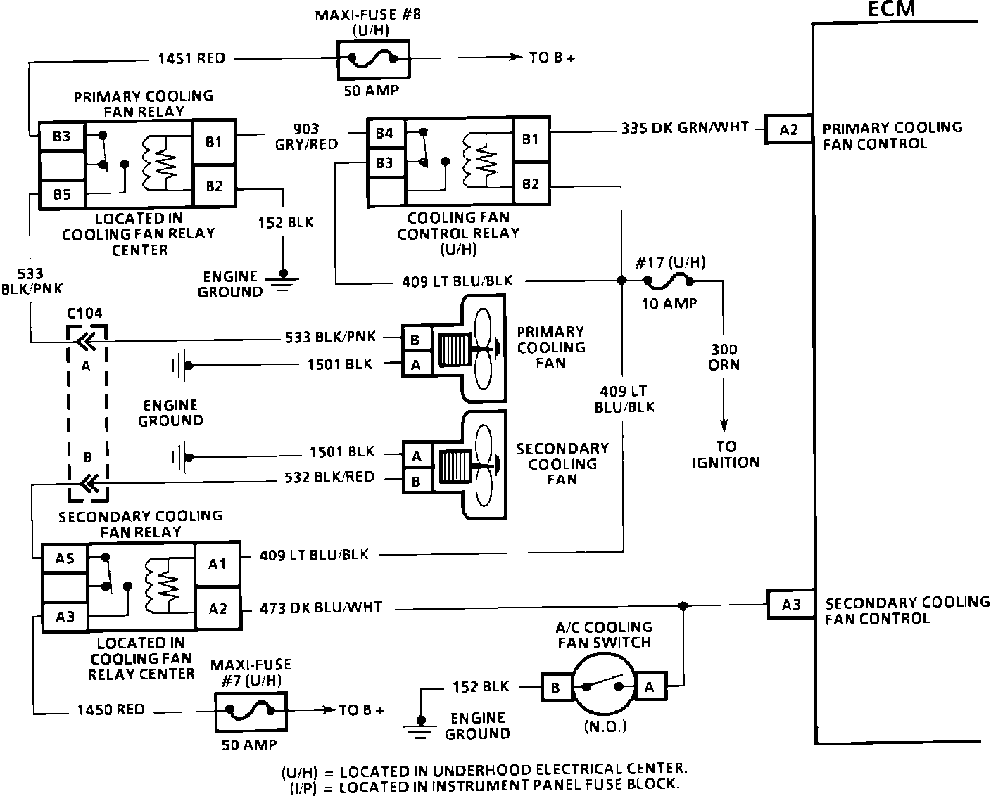 The cooling fans are controlled by the ECM based on various inputs. The primary cooling fan relay is energized by the cooling fan control relay when the cooling fan control relay is de-energized. The primary fan relay will be energized and supply battery voltage to the primary cooling fan motor. Grounding CKT 473 (relay terminal 2) will energize the secondary cooling fan relay (Fan 2) and supply battery voltage to the secondary fan motor.