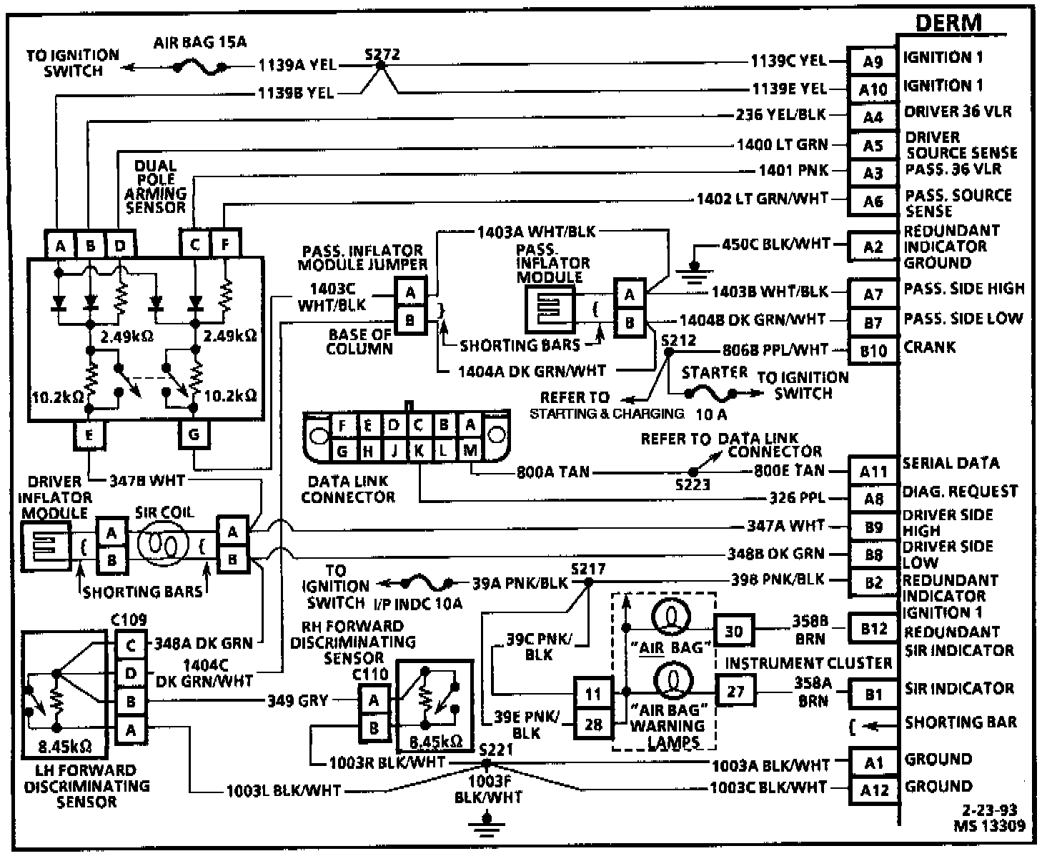 When the DERM recognizes "Ignition 1" voltage, applied to terminal "A9" and "A10", is in the normal operating voltage range, the "AIR BAG" warning lamp is flashed 7 times to verify operation. At this time the DERM performs "Turn-ON" tests followed by "Continuous Monitoring" tests. When no malfunctions are detected the DERM proceeds to the "Initiator Assembly Resistance Test." When a malfunction is detected the DERM sets a current diagnostic trouble code and illuminates the "AIR BAG" warning lamp. The DERM will clear current diagnostic trouble codes and move them to a history file when the malfunction is no longer detected and/or the ignition switch is cycled, except for DTC 51. DTC 51 can only be cleared using a scan tool "Clear Codes" command.