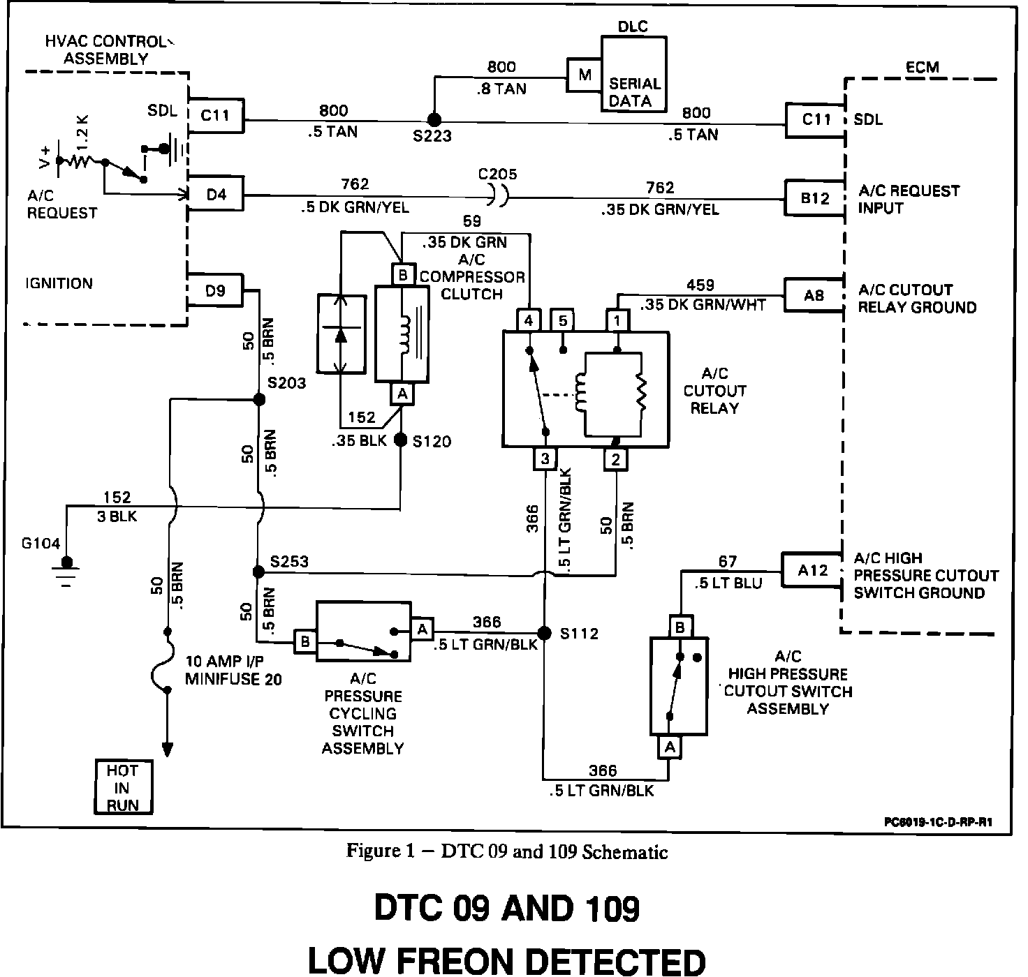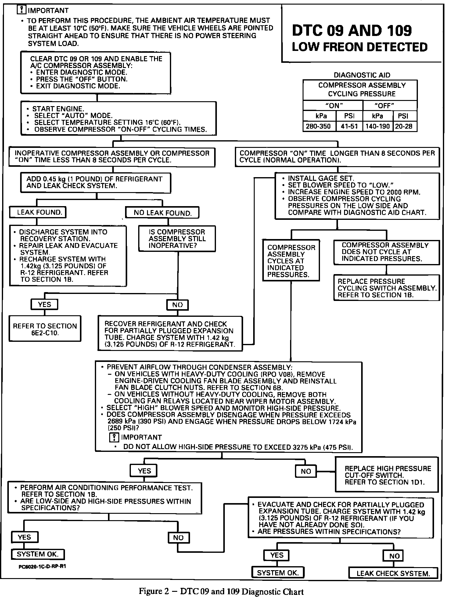 1. A/C may become inoperative due to the compressor clutch not engaging as a result of setting a diagnostic code 9 or 109 (low freon).