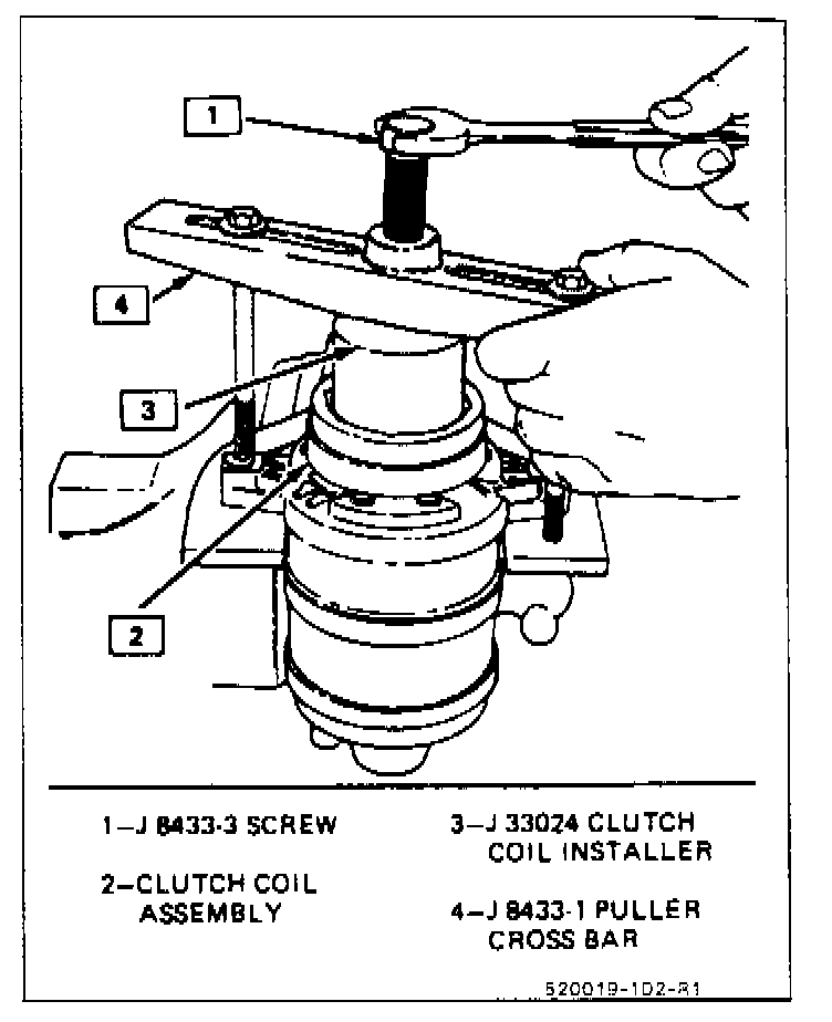 4. Turn the center forcing screw of the J 8433-1 puller crossbar to force the clutch coil onto the front head. Be sure clutch coil and J 33024 installer stay "in-line" during installation.