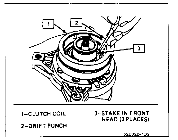 5. When coil is fully seated on the front head, use a 1/8" diameter drift punch and stake the front head at three places 120 degrees apart, to ensure clutch coil remains in position.