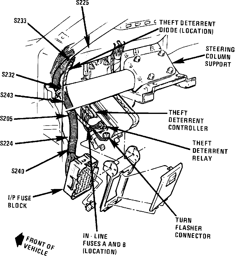 Component Location View. Behind I/P, Left of Steering Column: