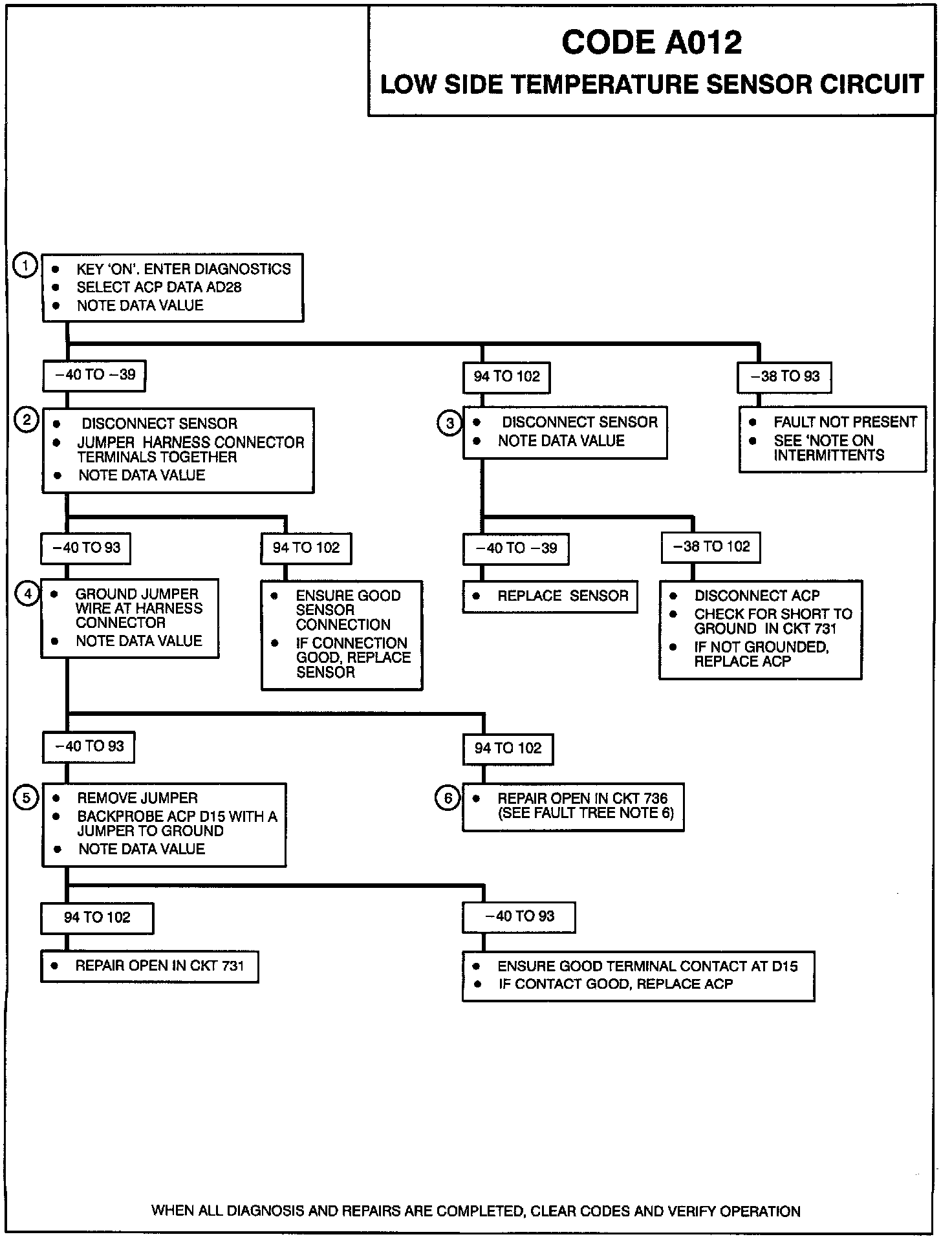 If an intermittent Code A012 is being set, Select ACP Snapshot Data for Code A012 and note value of AD28. A reading of approx -40°C indicates an intermittent open, a reading above 93°C indicates an intermittent short.