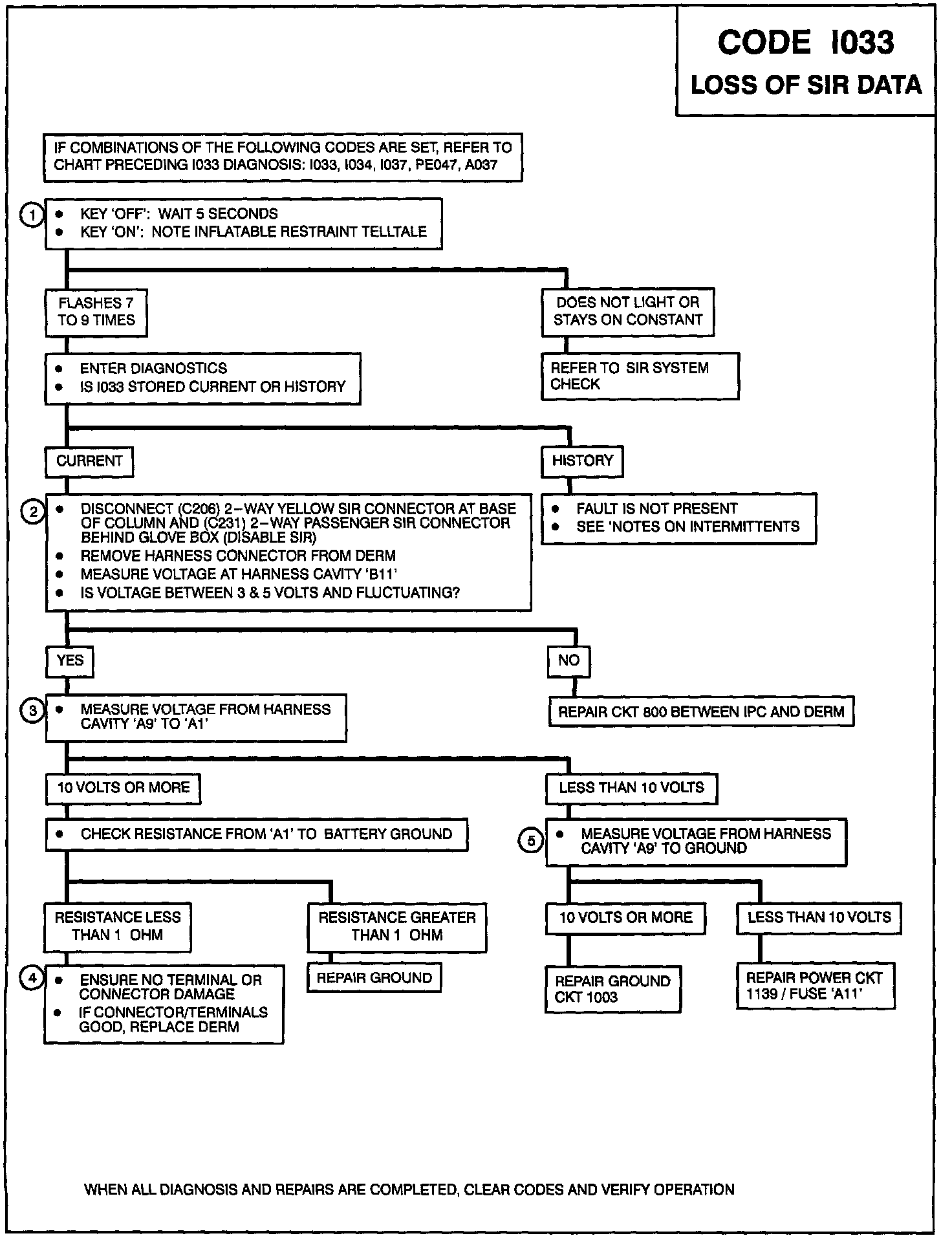 Code I033 will set if the ignition is on and the IPC is not able to exchange data with the DERM (Supplemental Inflatable Restraint (SIR) controller). If any other communication codes are stored along with I033, see the chart 'Multiple Intermittent Codes'. Multiple Data Communication Codes When this is the only communication code stored, the problem must be one of the following: