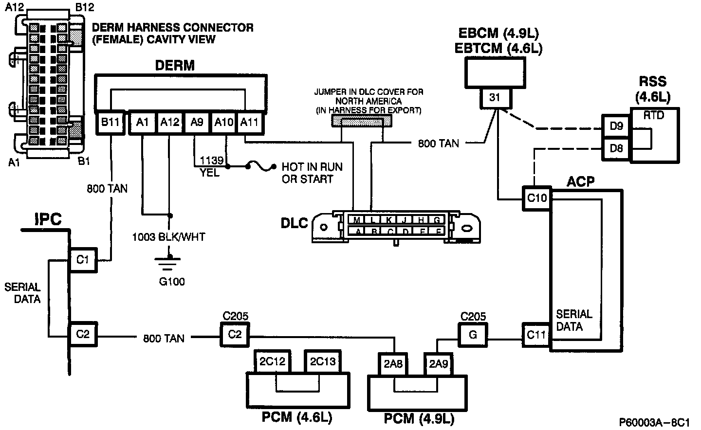 2. Disconnecting the 2-way connector disables the SIR system for diagnosis. Cavity 'E11' is the serial data line to the IPC. Under normal operation the voltage on this line will appear as 3 to 5 volts and be constantly fluctuating. If this is not the case, the most likely cause is an open in CKT 800 between the IPC and the DERM.
