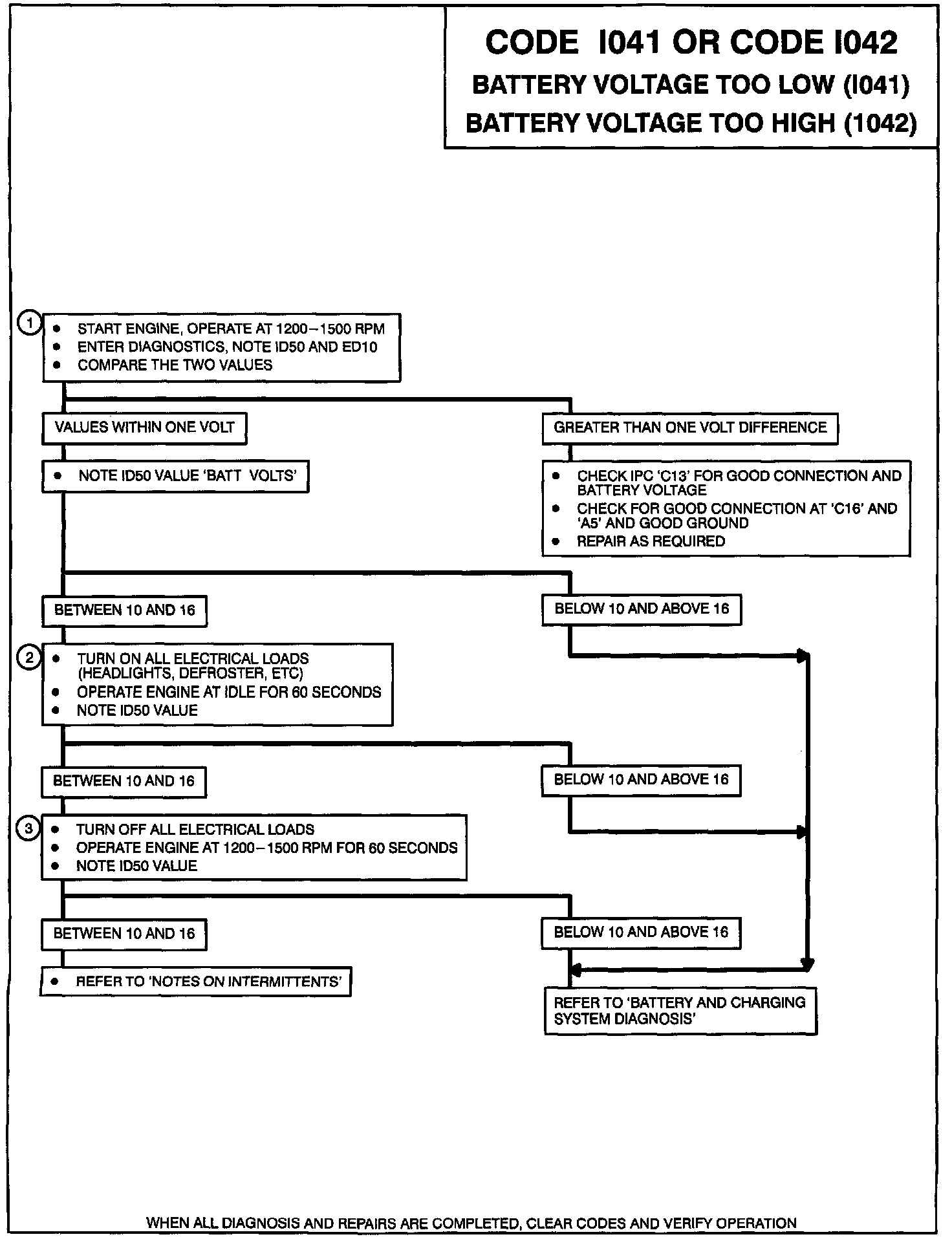 If an intermittent Code I041 or I042 is being set, observe IPC I041/I042 snapshot data value for ID50. This will show the voltage at the time the code was set. Snapshot information for parameters ID60 (vehicle speed), II94 (parklights on/off), and II10 (generator feedback) may also be useful in determining vehicle conditions when the code is being set.