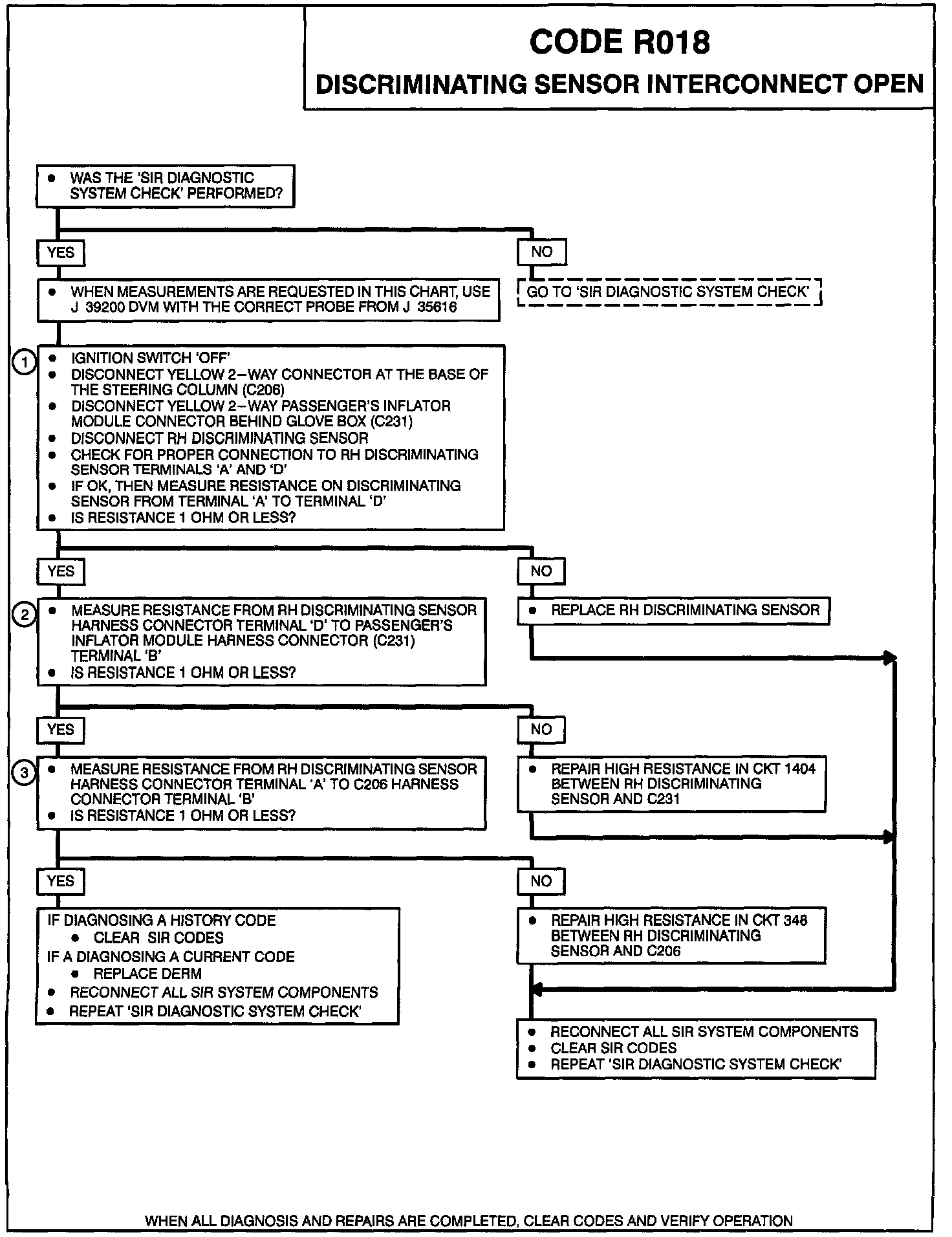 3. Code R018 remains current until both the 'DRIVER'S SENSE LOW' and 'PASSENGER'S SENSE LOW' voltages are less than 3 volts during both the 'Initiator Circuit Resistance' tests or '10 Minute Loop' test.
