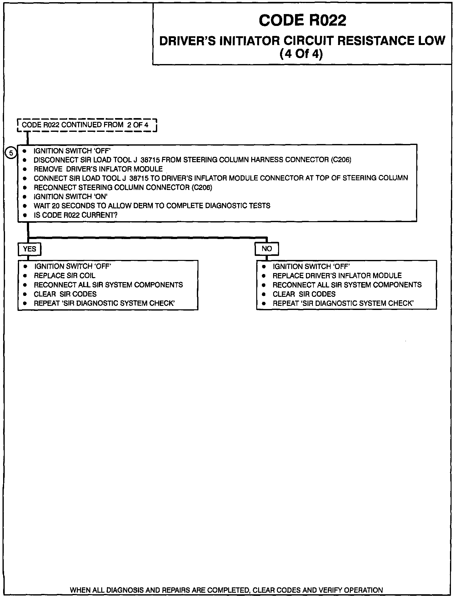 During the 'Initiator Circuit Resistance' tests, the DERM grounds the 'PASSENGER'S SENSE LOW', terminal 'B7', and turns 'ON' the driver's current source at 'DRIVER'S SENSE HIGH', terminal 'B9', and injects a 150 milliamp current for 50 milliseconds into the circuit. During this test the DERM monitors the voltage at 'DRIVER'S SENSE LOW' and 'DRIVERS SENSE HIGH'. The voltage difference between 'DRIVER'S SENSE HIGH' and 'DRIVER'S SENSE LOW' is used to calculate the resistance of the driver's initiator loop. When the resistance is below a given value, Code R022 is set.
