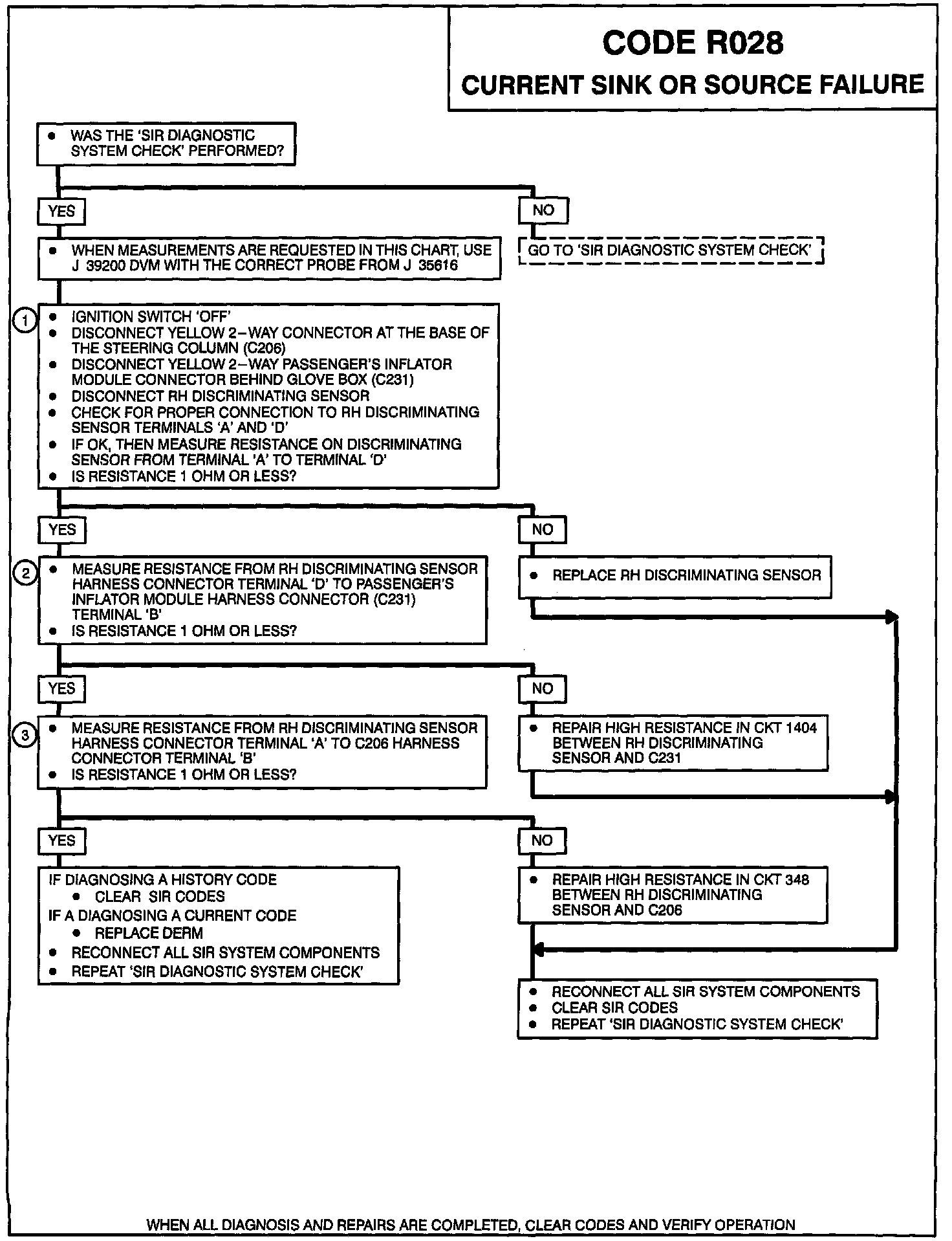 During the 'Initiator Circuit Resistance' tests, the DERM grounds the 'PASSENGER'S SENSE LOW', terminal 'B7', and turns 'ON' the 'Drivers Current Source' at 'DRIVER'S SENSE HIGH', terminal 'B9' and injects a 150 milliamp current for 50 milliseconds into the circuit. The DERM then grounds the 'DRIVER'S SENSE LOW', terminal 'B8', and turns 'ON' the 'Passenger's Current Source' at 'PASSENGER'S SENSE HIGH', terminal A7', and injects a 150 milliamp current for 50 milliseconds into the circuit. During each of these tests, the DERM monitors the voltage at 'DRIVER'S SENSE LOW', 'DRIVER'S SENSE HIGH', 'PASSENGER'S SENSE LOW' and 'PASSENGER'S SENSE HIGH'. The voltage difference between 'DRIVER'S SENSE HIGH and LOW', and 'PASSENGER'S SENSE HIGH and LOW' is used to calculate the resistance of the Driver's and Passenger's initiator loops. When either loops voltage difference is outside a given range, Code R028 is set.